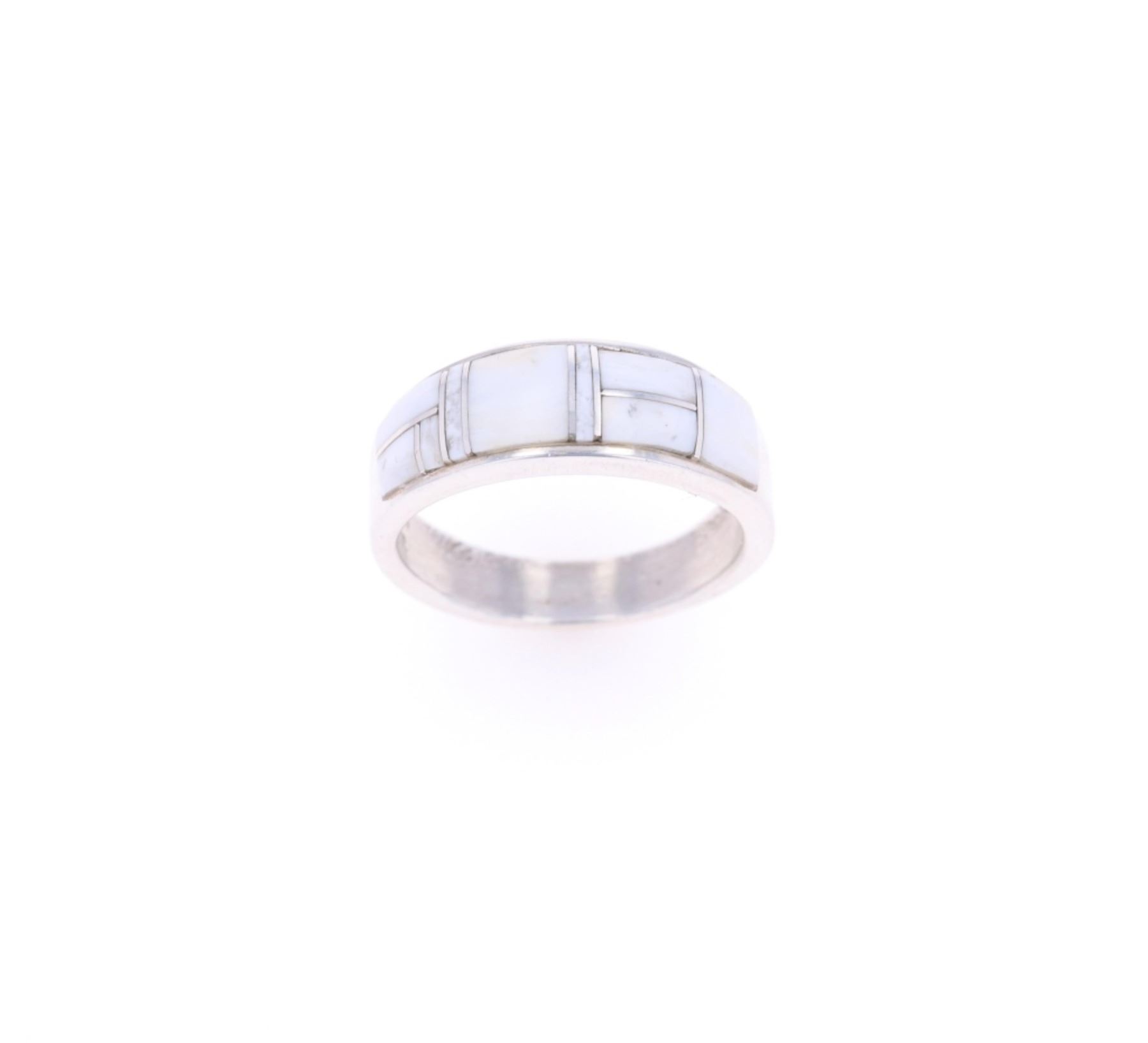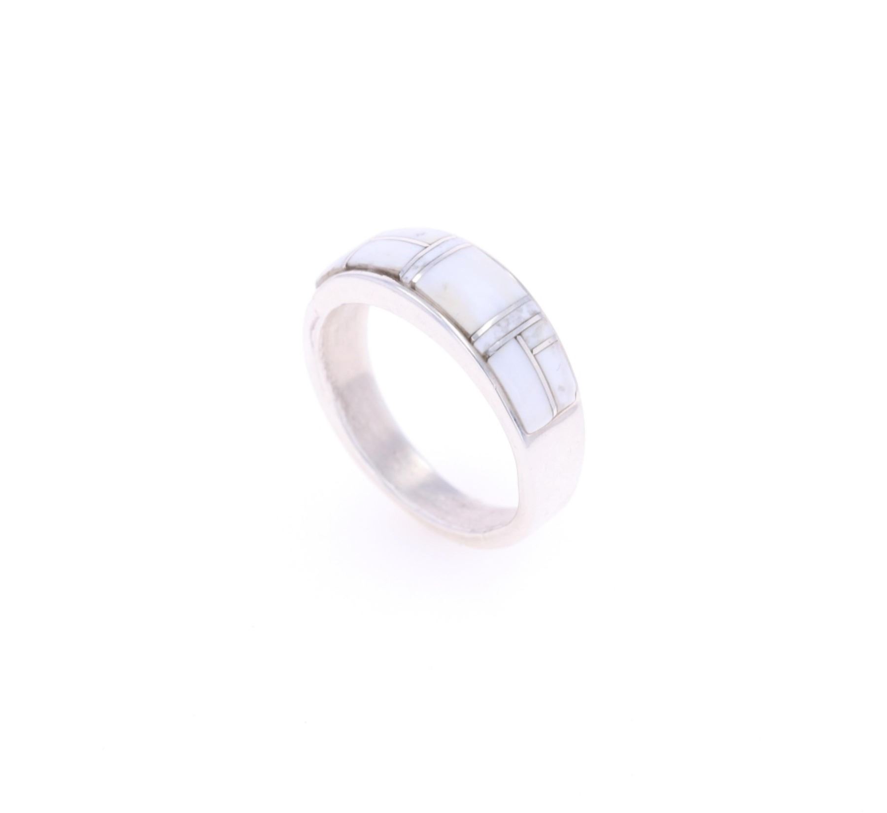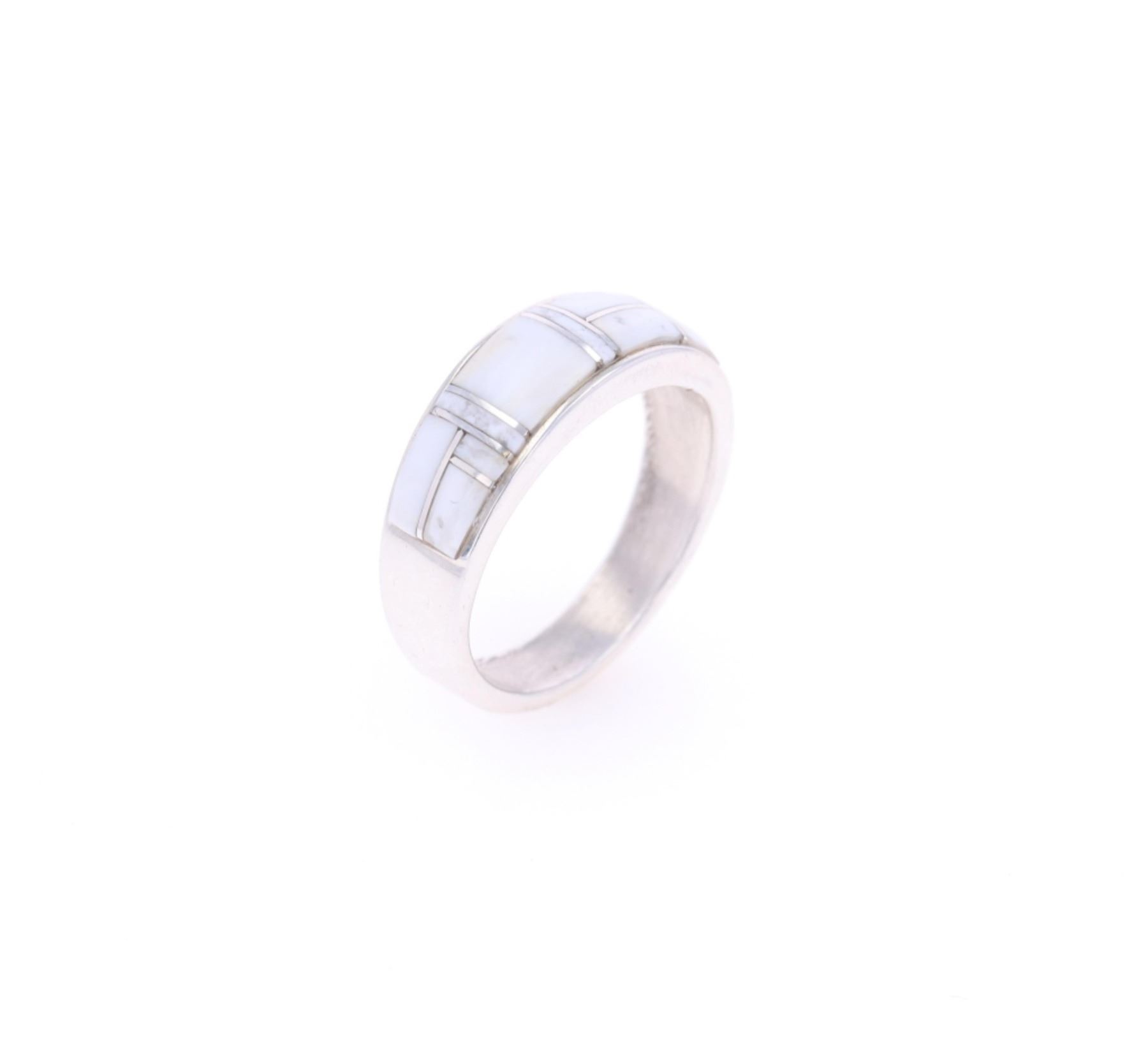 Featured in this lot is this sterling silver and white buffalo turquoise ring from Navajo artist Angie Tom. The ring features a wonderfully and professionally crafted sterling silver construction that shows a semi mosaic inlay of white buffalo turquoise cabochon set into the face. The ring is marked as follows: AT - Ster. The condition of this Navajo ring is good with no obvious signs of damage and shows good overall condition. The overall measurements of this ring is 1" x 1" x 3/8" and the ring size is US 11 1/2. The collective weight of this ring is 8.5g.