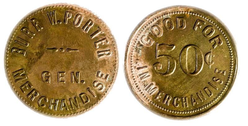 Obverse: Burr W. Porter / Gen. / Merchandise; Good For / 50c / In Merchandise. Br, 31mm, R9. Extremely fine condition.