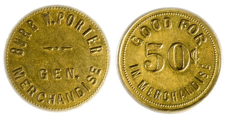 Obverse: Burr W. Porter / Gen. / Merchandise; Good For / 50c / In Merchandise. Br, 35mm, R9. Extremely fine condition.