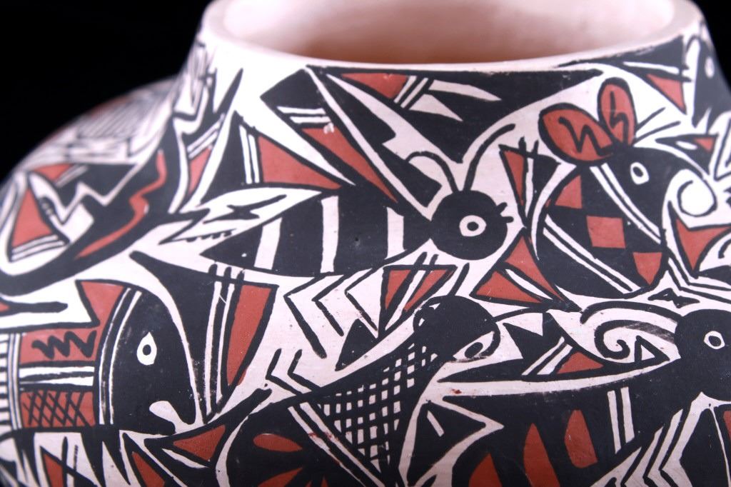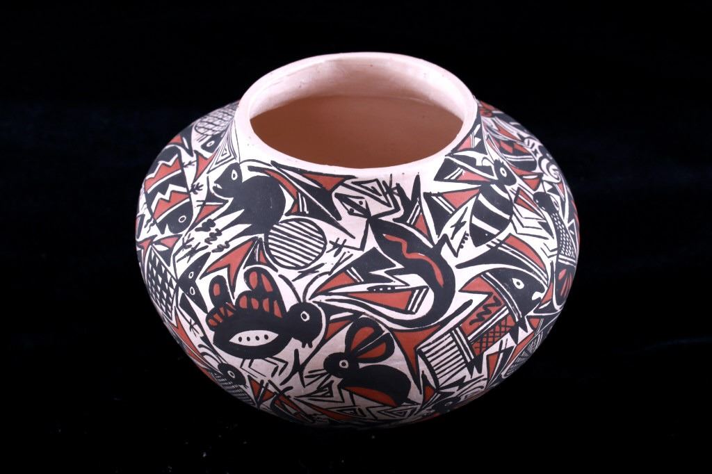 Berleen Estevan is a full blooded Native American Indian. She was born into the Acoma Pueblo in 1975. She has been working with pottery since 1985, at the age of 10. She was inspired to learn the process of pottery making by her Grandmother, the late famous, Lucy Juanico. The Acoma Pueblo pottery style is characterized by fluted rims and thin walls. Acoma artists are well known for their fine line painting and geometric patterns, which often symbolize elements from nature. A piece of pottery can take 60-80 hours to create before firing. This fine jar is covered with highly detailed animals, predominantly bees in black and rust on a neutral cream base. On the bottom of the jar is B. Estevan, Acoma, New Mexico. The jar is 4" tall, with a 2" opening and measures 14" around, and has no obvious signs of damage.