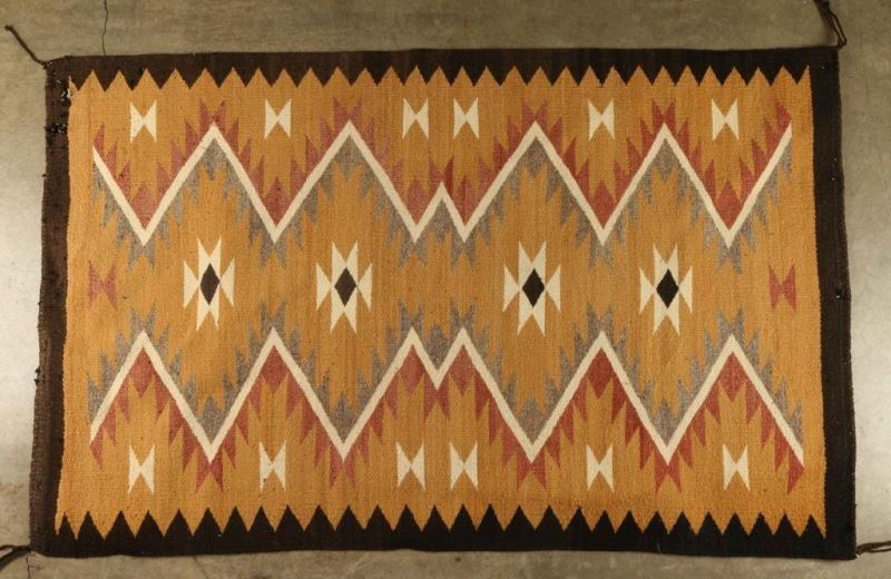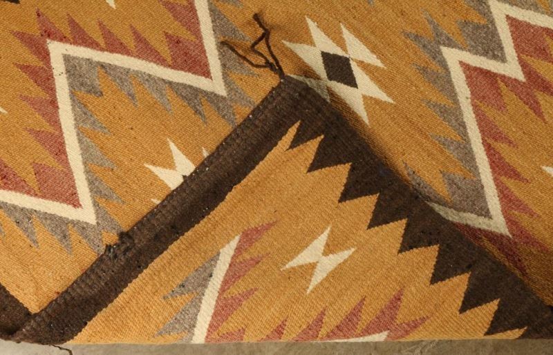 With a zig-zag pattern in yellow,orange,grey and white. Good conditions shows some holes and scattered losses. Measures 50' x 32"