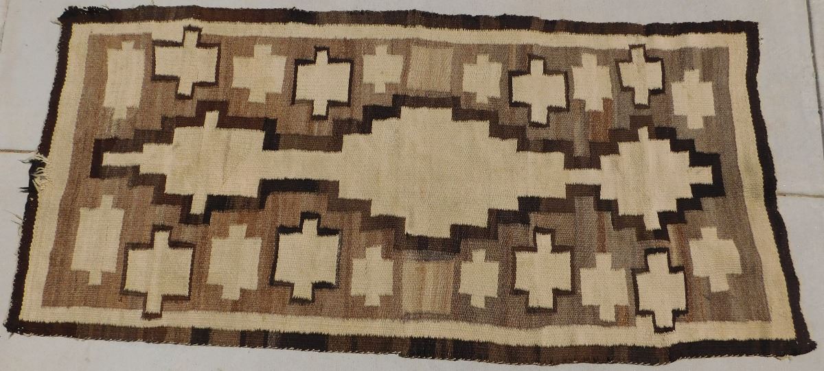 Navajo All Natural Weaving, circa 1920s. Made of wool, item measures 83" x 40" and is Navajo, from Arizona. Rug has crosses design. Condition: Edge damage, stains, see images. Shipping: $35.50.