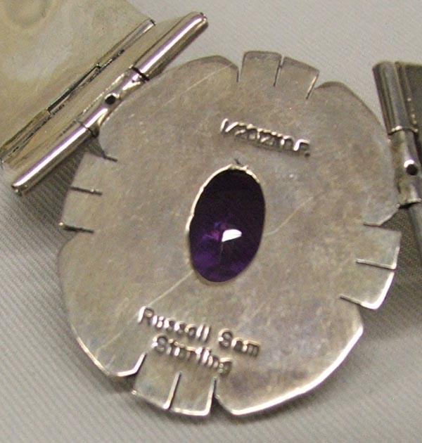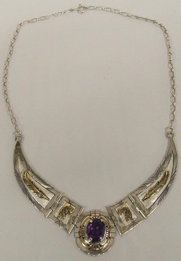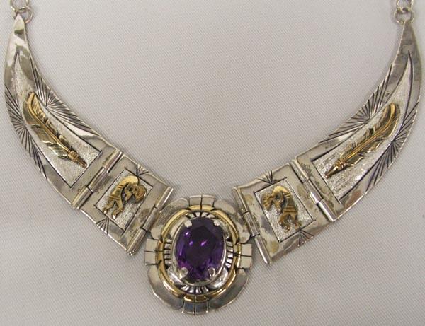 Navajo Amethyst Choker by Russell Sam, Gold Kokopelli on Sterling Silver, measures 16.5''. SHI $15.