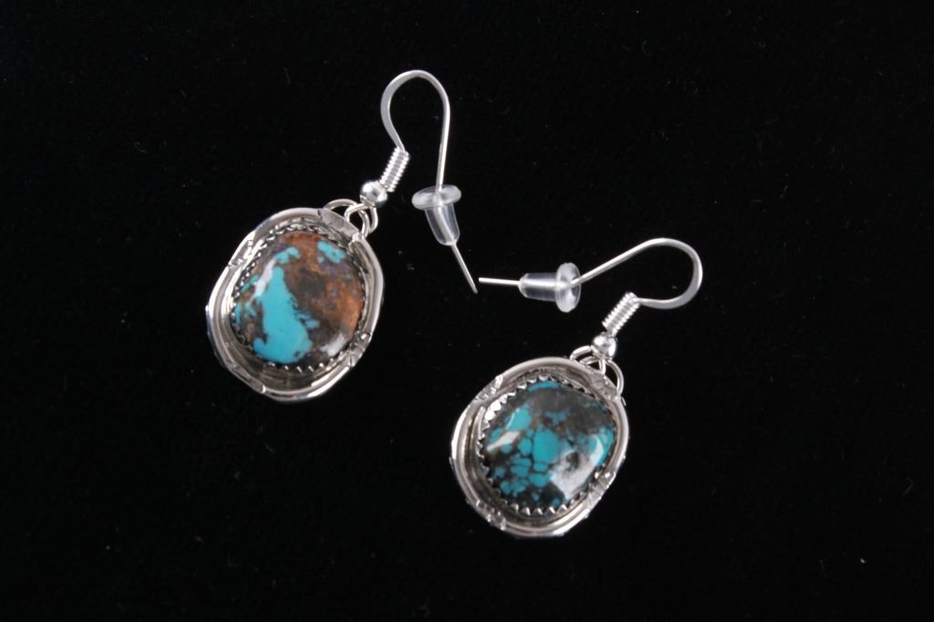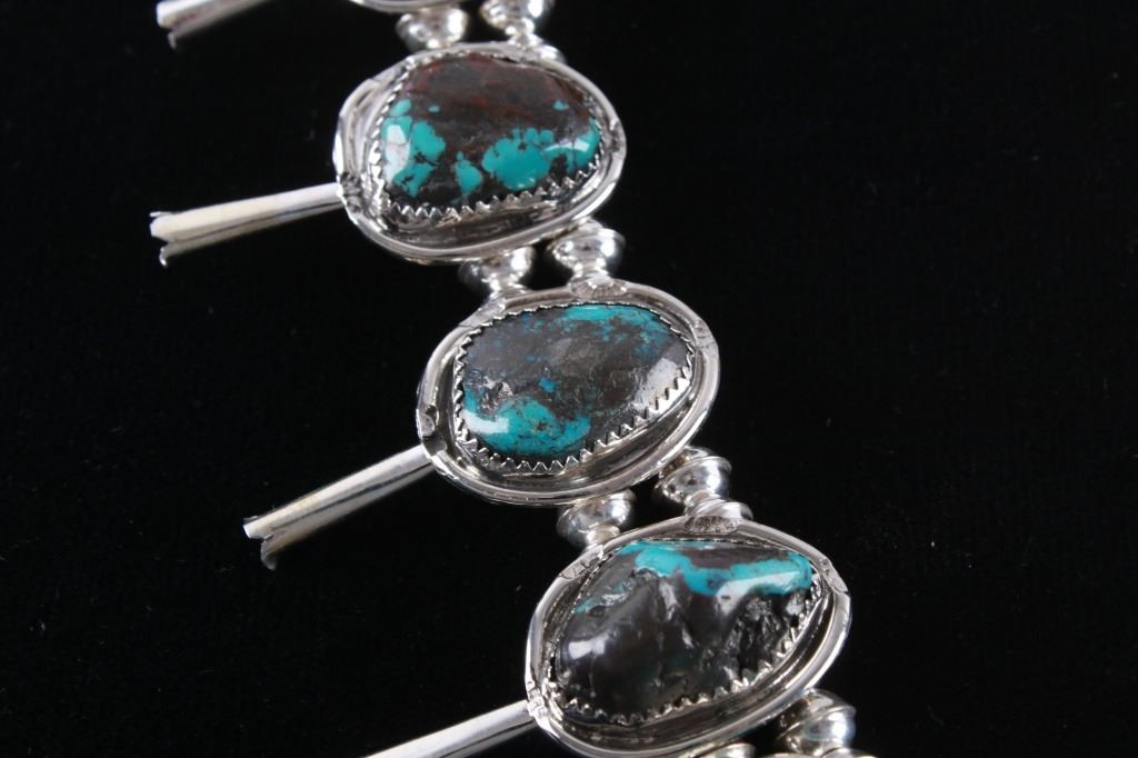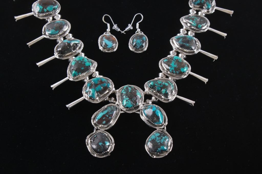 The lot features a beautiful sterling silver and turquoise squash blossom necklace and earring set that is signed. The pair is set with beautiful polished cabochons stones from the Apache Blue Turquoise min near Tonopah, Nevada in the Candelaria Mountain range. The squash blossom necklace shows a classic stamped sterling silver stone setting with polished nugget design and oblong blossom ends with double row of concho / concha sterling pearl beads. Under the clasp are thin long Sterling silver stamped cones. The naja squash is stamped / signed "P" and "Sterling". The earrings are set in sterling silver with the matching polished nugget turquoise stones with metal earing loops. The set is in brand new condition with no damge and displays beautifully. Overall measures 23"L clasp to clasp, squash pendant is 2.5" by 2.5". Total weight of 121.60 grams.
