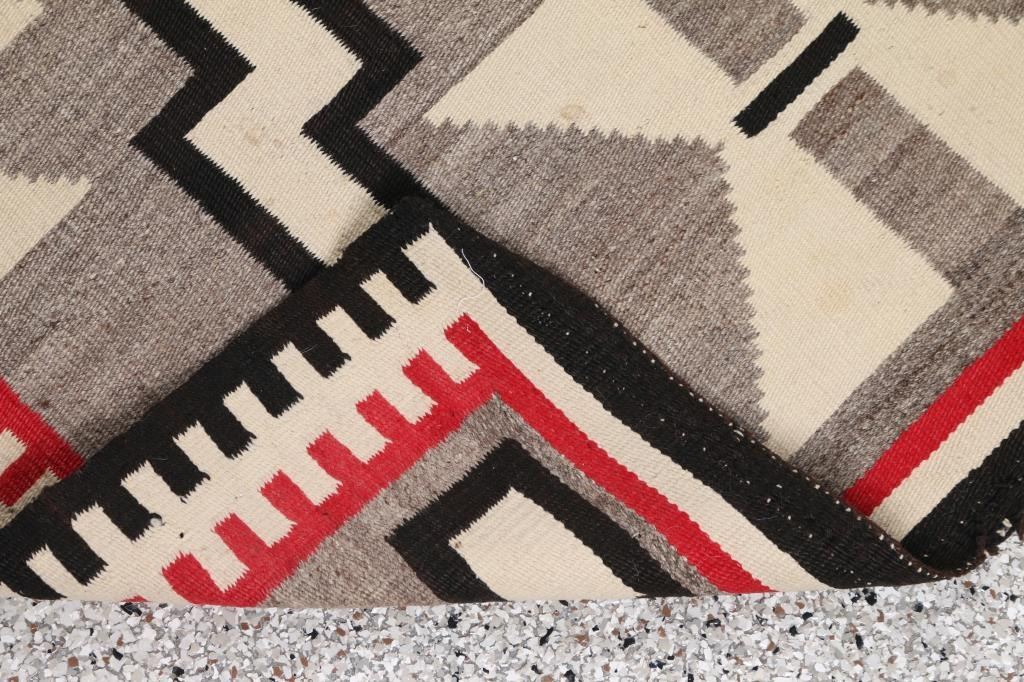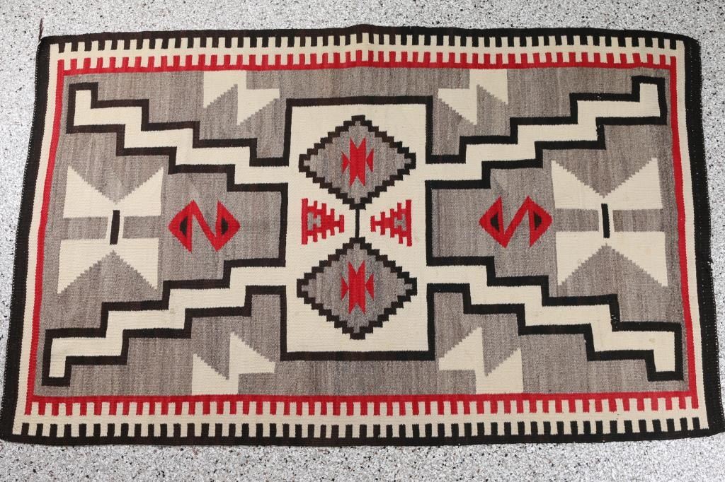 Red, black, brown, cream. Measures 39" x 62". Good condition with some minor stains.