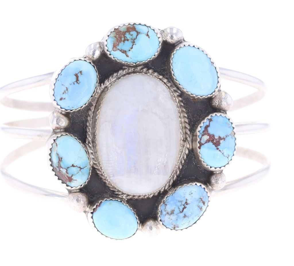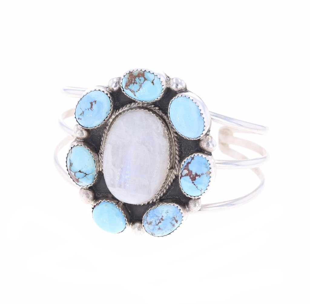 Featured in this lot is a Dry Creek turquoise bracelet from Navajo smith, Bernadine Begay Tsosie. The bracelet features a wonderfully and professionally crafted sterling silver and turquoise construction that shows a triple bar frame with seven dry creek turquoise surrounding a large quartz cabochon in the center. The bracelet is marked as follows: BBT - Sterling. The condition of this Navajo bracelet is good with no obvious signs of damage and shows good overall condition. The measurements of this bracelet are 2 1/8" x 2 1/8" x 2 5/8" and the circumference is 5". The collective weight of this bracelet is 44.2g.*