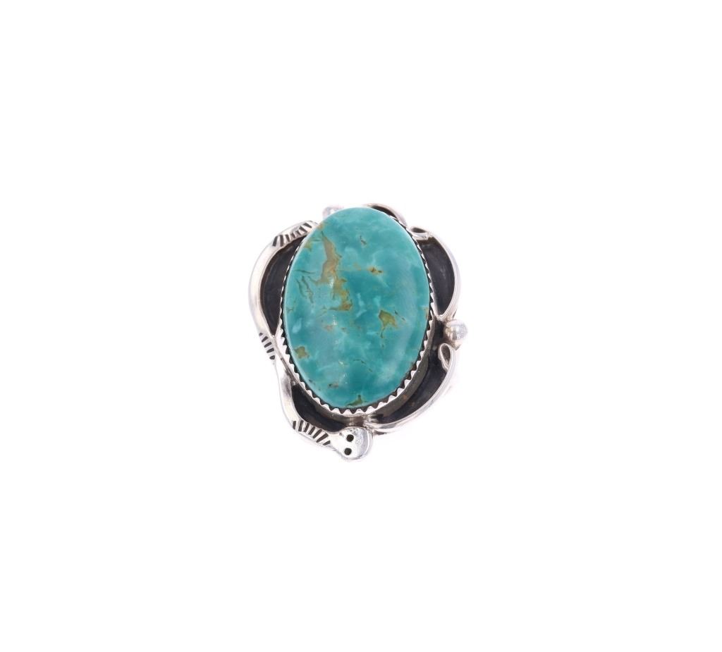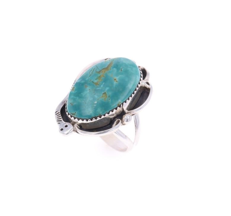 Featured in this lot is this Cripple Creek Turquoise ring from Navajo artist Bernadine Begay Tsosie. The ring features a wonderfully and professionally crafted sterling silver and Cripple Creek Turquoise construction that shows a snake around the outside border of the ring with stamped and tooled decoration that shows a split shoulders ring band. The ring is marked on the bottom of the face as follows: BBT - Sterling. The condition of this Navajo ring is good with no obvious signs of damage and shows good overall condition. The measurements of this ring is 1" x 1 1/8" x 1" and the ring size is US 7 1/2. The collective weight of this ring is 10.5g.