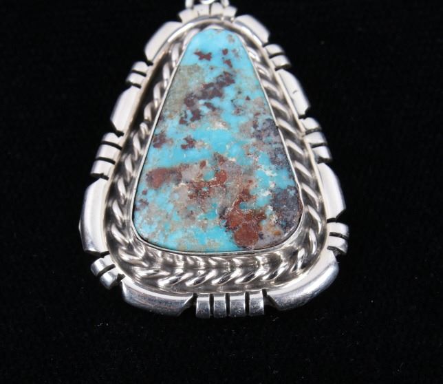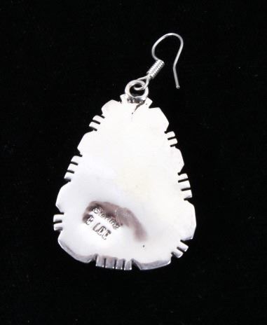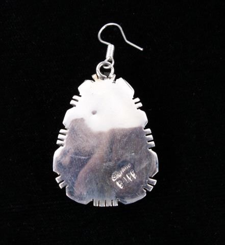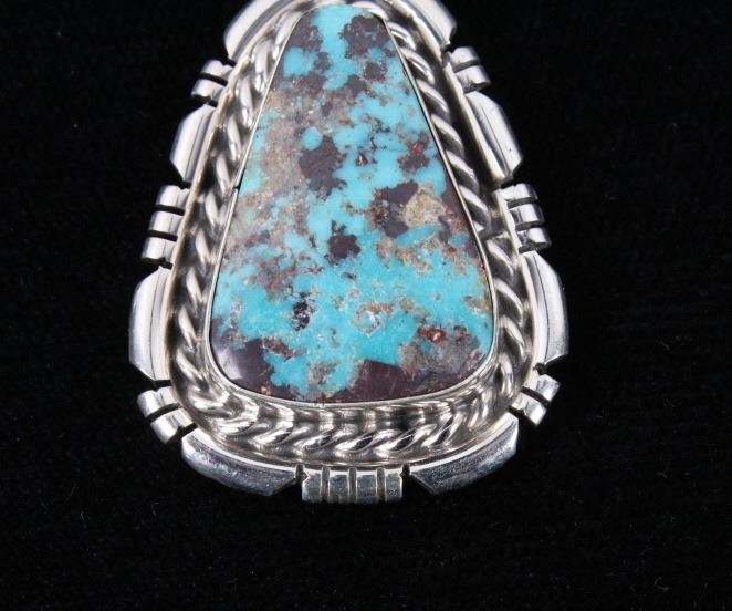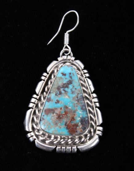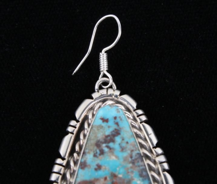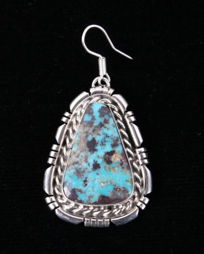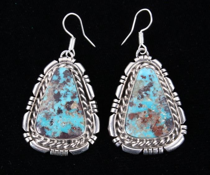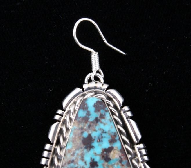For your consideration is a pair of gorgeous Navajo Native American Betta Lee Apache turquoise and sterling silver earrings. The Apache Blue turquoise mine is a small mine with lots of potential. The mine is located near Tonopah, Nevada in the Candelaria Mountain range. The earrings feature a lovely polished cabochon of Apache turquoise. The stones are expertly set in a shadow box setting with twisted braided rope and hand stamped border. The back of the earrings are stamped “Sterling” and “B. Lee” for Navajo artist Betta Lee. The earrings measure 1 ¾” x 1”.