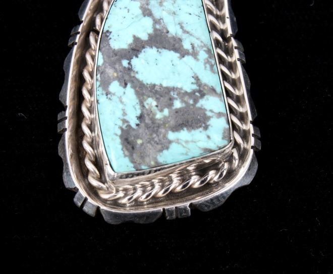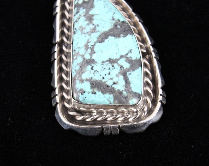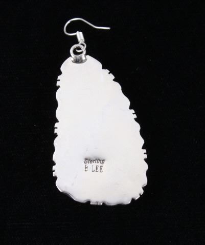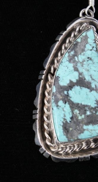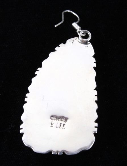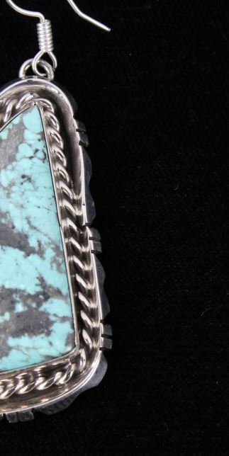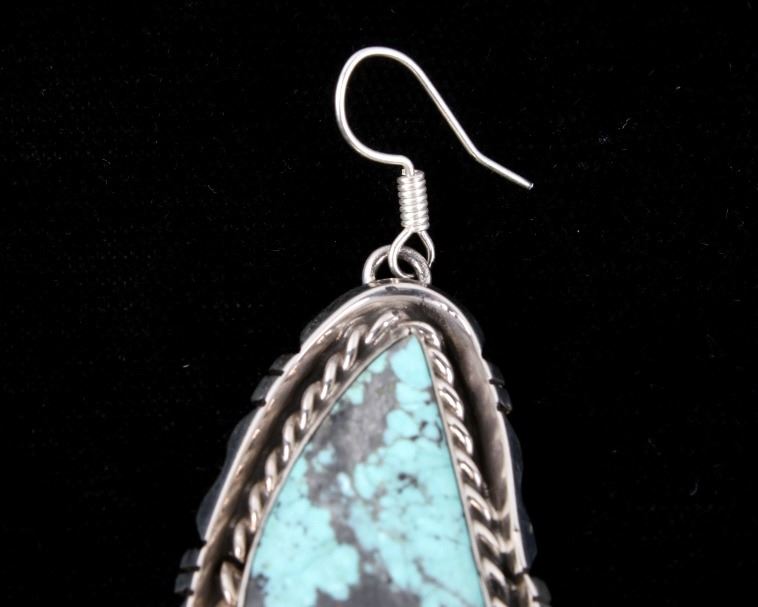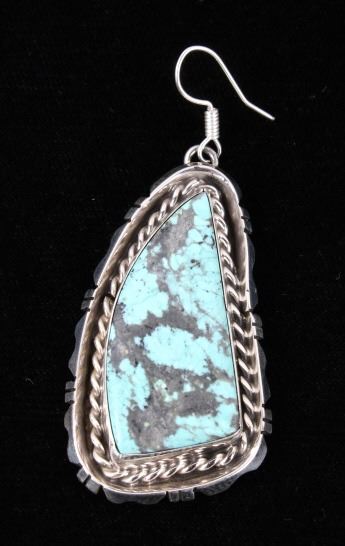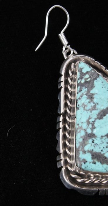 For your consideration is a gorgeous pair of Navajo Native American Betta Lee Number 8 turquoise and sterling silver earrings. The Number Eight turquoise mine in Eureka County north of Carlin, Nevada was discovered in 1925 and first mined in 1929. At present, the mine is closed to turquoise mining; it is mined today for gold. The mine produced some of the largest nuggets of turquoise ever discovered. Almost all the turquoise produced is of the spider web type, with the matrix varying from golden brown to black. The stones are expertly set in a shadow box setting with twisted braided rope and hand stamped border. The back of the earrings are stamped “Sterling” and “B.Lee” for Navajo artist Betta Lee. The earrings measure 2” x 1”.