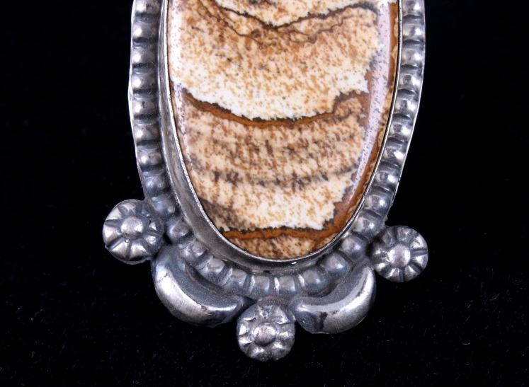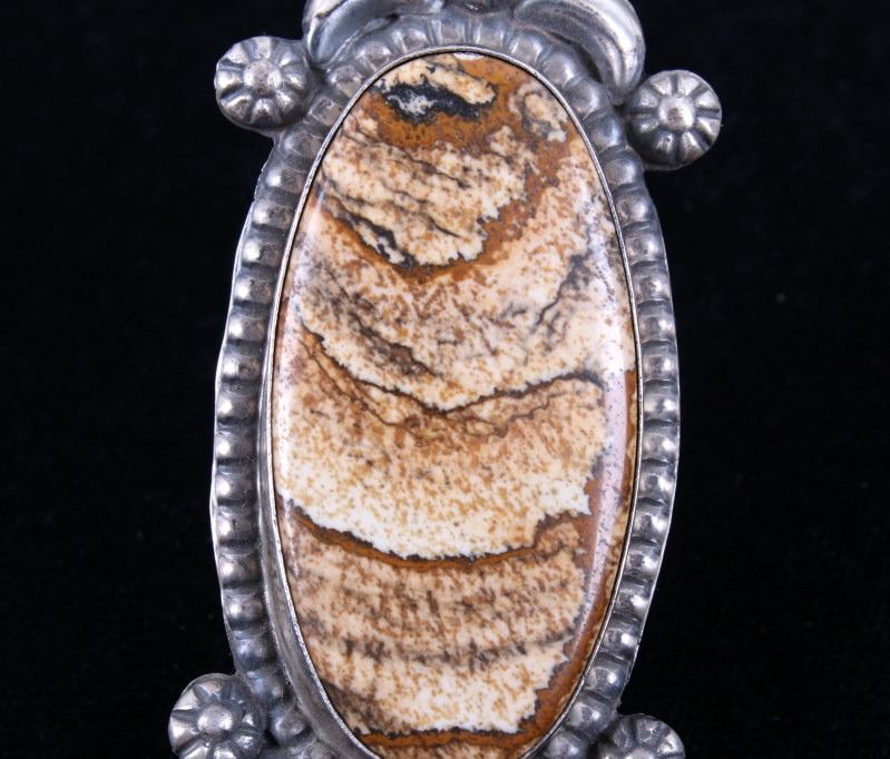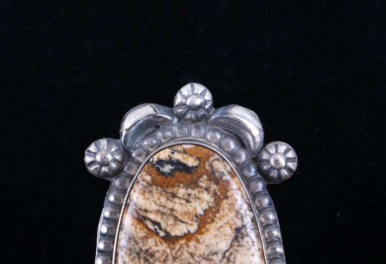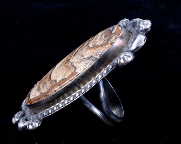 Included in this lot is a Navajo Native American Picture Jasper sterling silver ring. Picture Jasper, a remarkable form of Brown Jasper, is characterized by masterful “scenes” and landscape patterns formed by nature. This stunning ring showcases a large polished cabochon of Picture Jasper in a shadow box setting. The sterling silver ring features six petite hand stamped accents as well as a border of silver beads. The back of the ring has a lovely dark gray patina and is stamped by the artists Betta Lee and marked “Sterling”. The ring measures a US size 8.5.