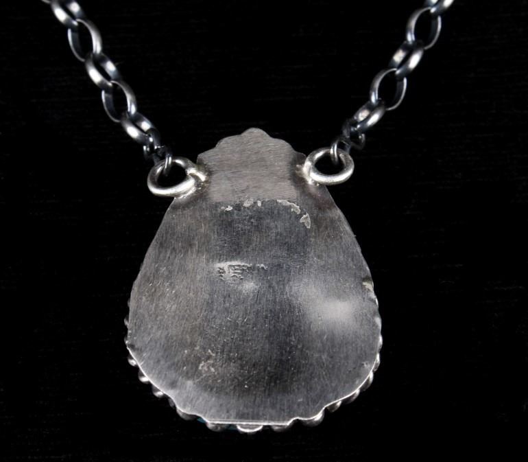 For your consideration is a signed Navajo Native American sterling silver and Kingman turquoise necklace. This is a beautiful handmade piece by expert silversmith Betta Lee. The necklace has a sterling link chain that displays a large nuggest Kingman turqiouse gemstone pendant. The pendant displays a twisted rope and bead design around the edge. The sterling shows nice bright patina with a polished back. The back of the pendant is marked "Sterling." It measures approximately 18" unlatched and the pendant measures 1 1/8" x 1 1/2"