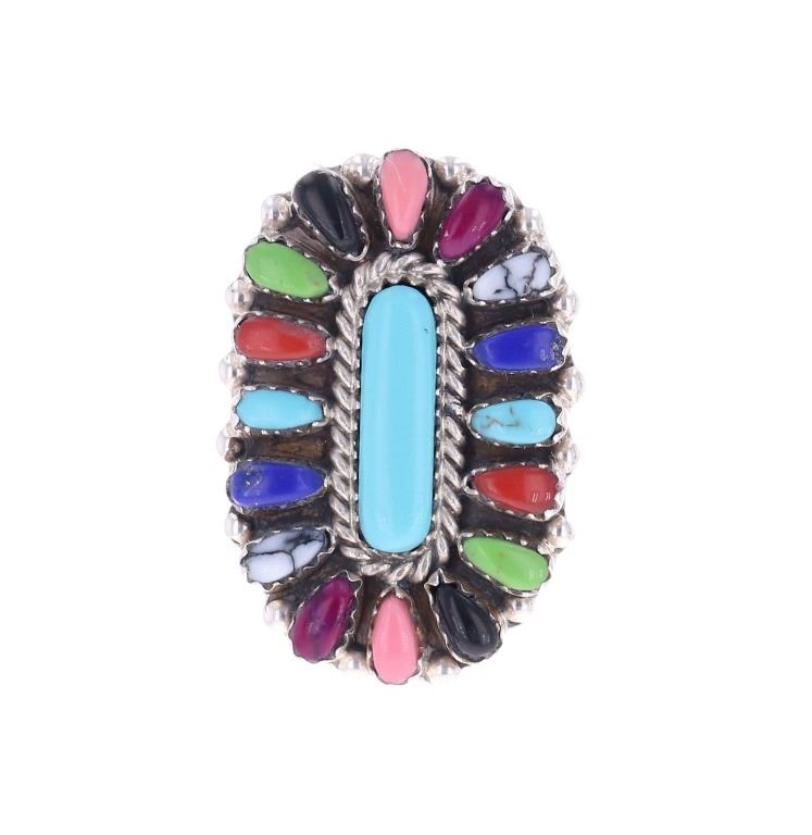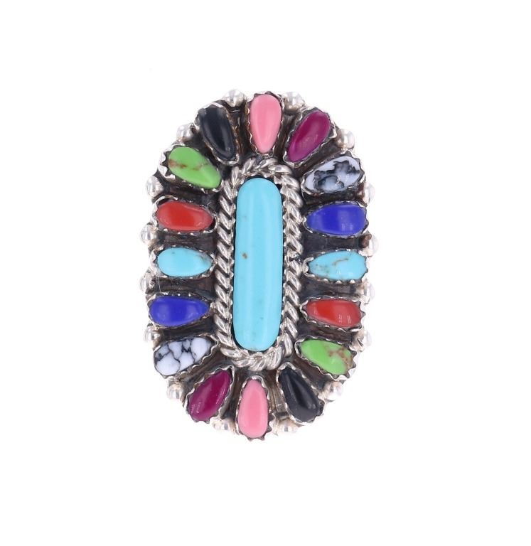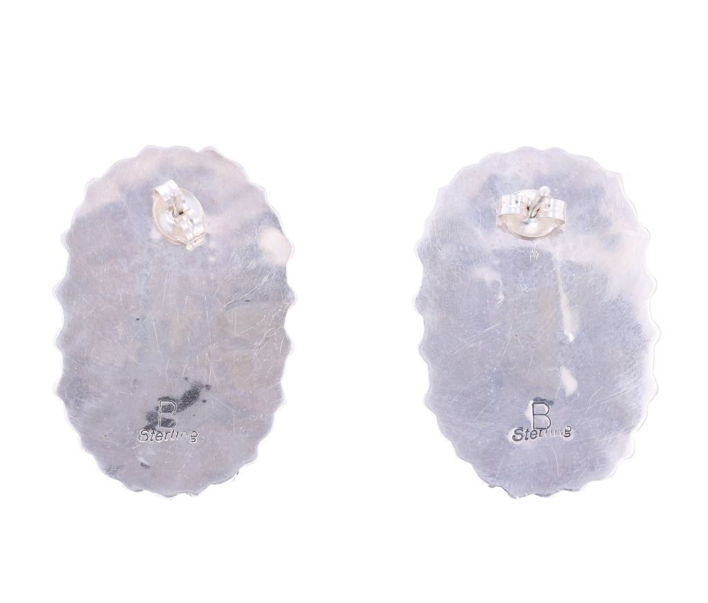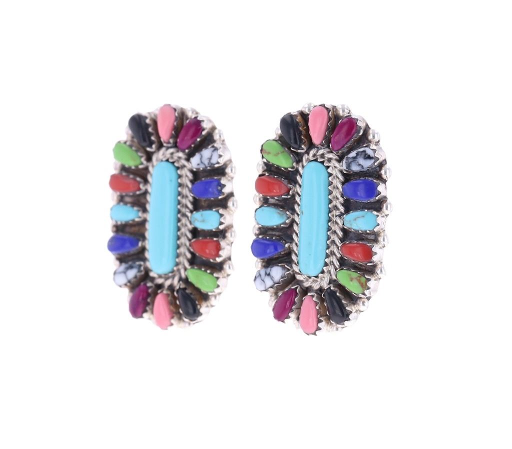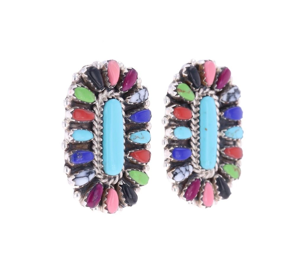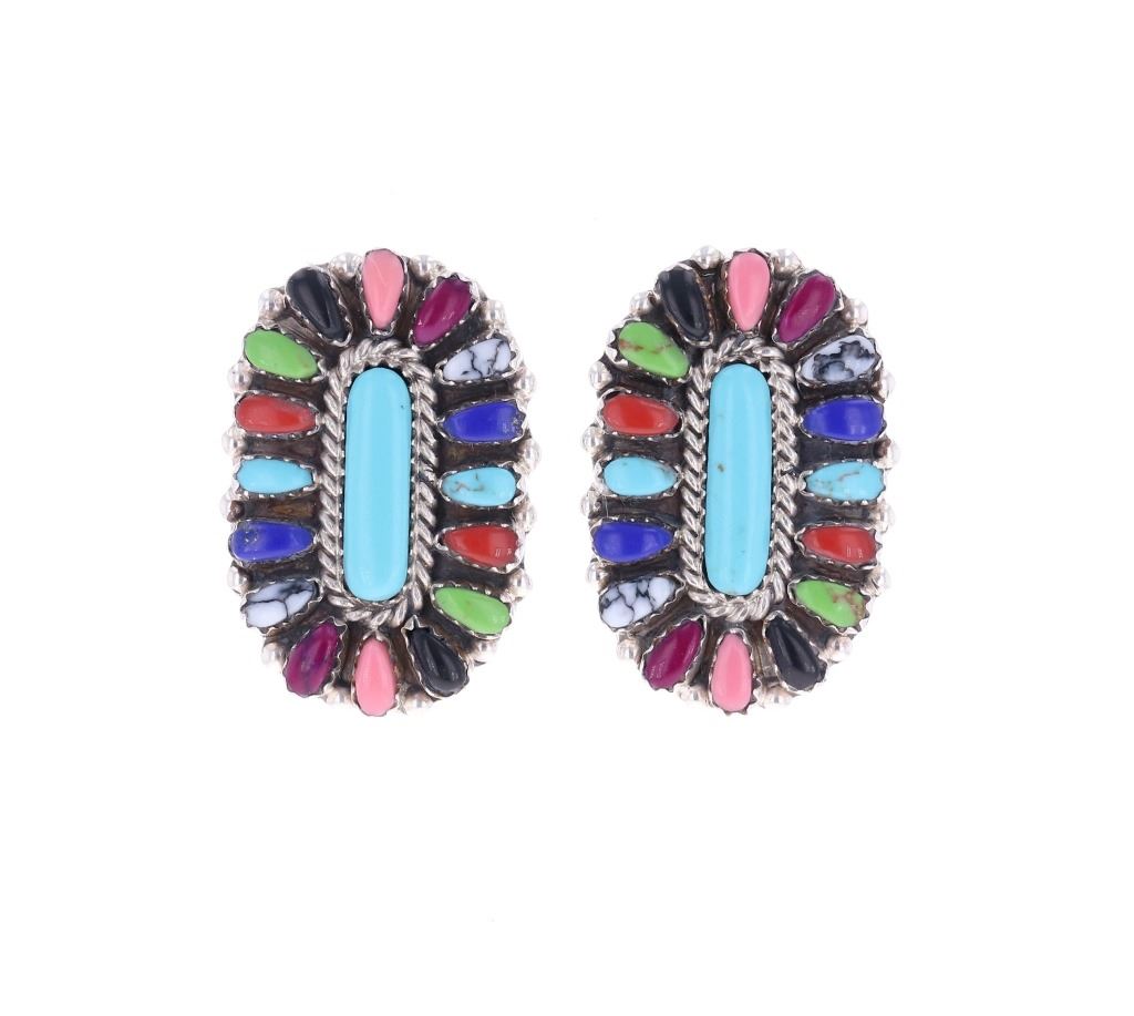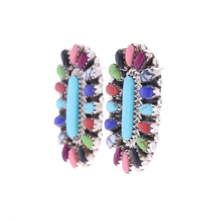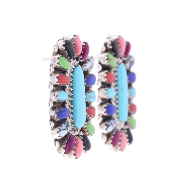 Featured in this lot is this sterling silver multistone earrings from Navajo artist Billy Slim. The pair of earrings shows a wonderfully and professionally crafted sterling silver and mulitstone construction that includes gemstones of Sonoran Turquoise, red branch coral, turquoise, pink conch, White Buffalo Turquoise, agate, and jet that shows a twisted rope border for the centerstone. The earrings are marked as follows: B - Sterling. The condition of this pair of Navajo earrings is good with no obvious signs of damage and shows good overall condition. The measurements of this pair of earrings is 1 1/4" x 7/8" The collective weight of this pair of earrings is 10.3g.