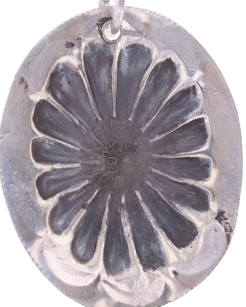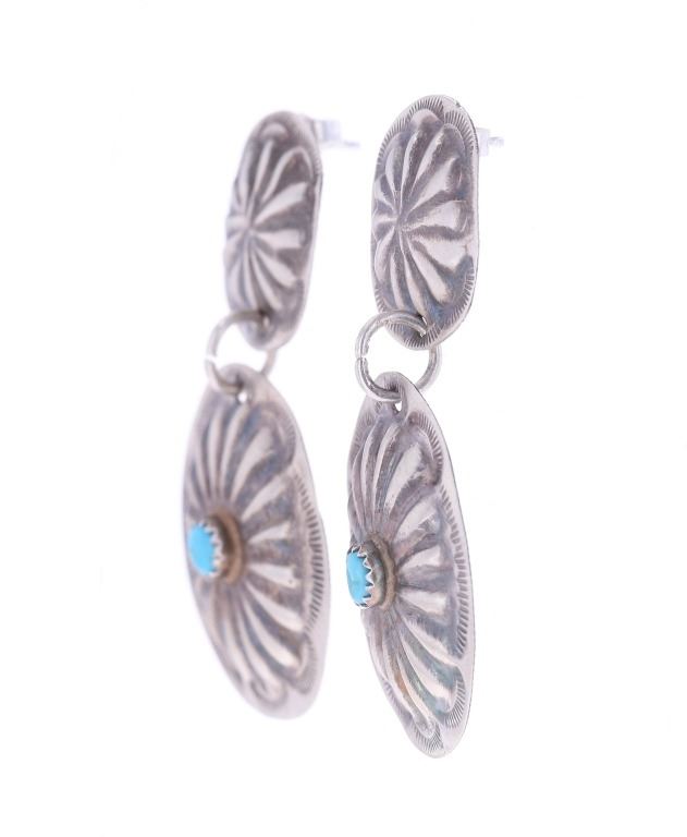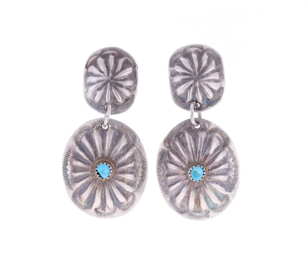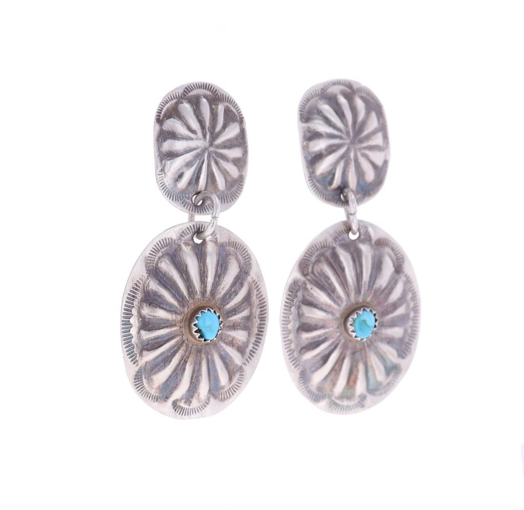 Featured in this lot is this sterling silver turquoise earrings from Navajo artist Billy Slim. The earrings feature a wonderfully and professionally crafted sterling silver and turquoise construction that shows a pressed spoon style with embossed and stamped decoration that shows two round cut turquoise cabochon set into the dangle earrings. The earrings are marked on the back as follows: B - Sterling. The condition of this pair of Navajo earrings is good with no obvious signs of damage and shows good overall condition. The measurements of this pair of earrings is 2" x 1". The collective weight of this pair of earrings is 6.4g.