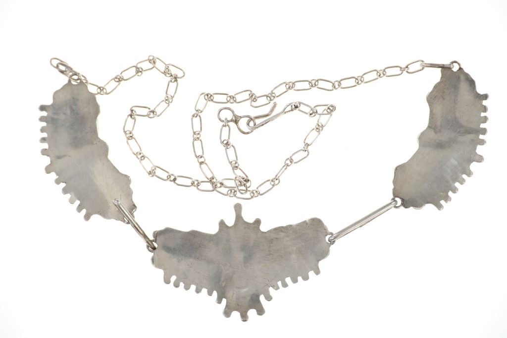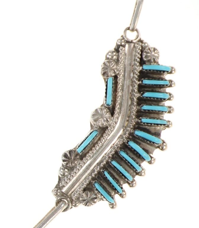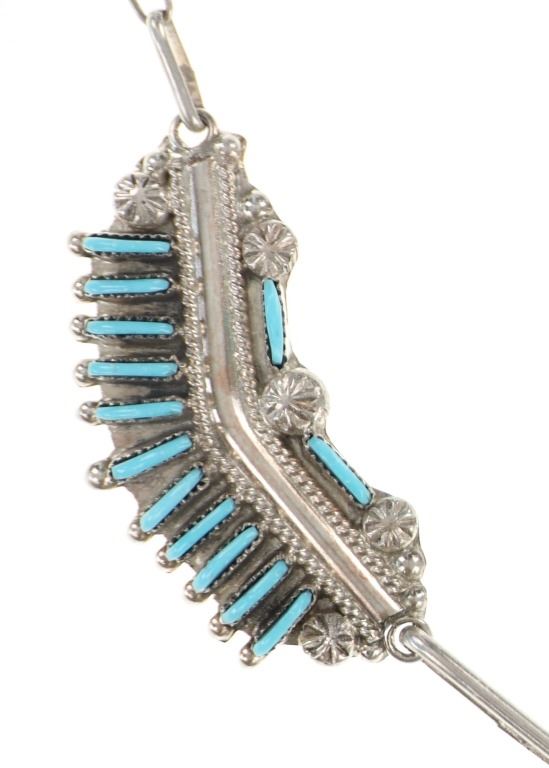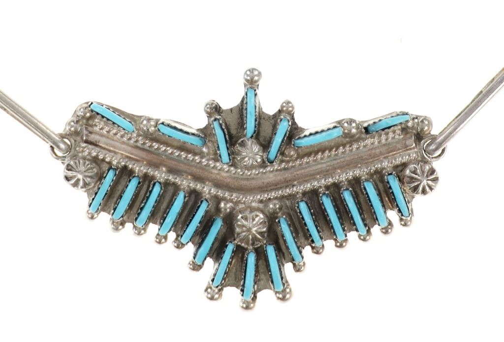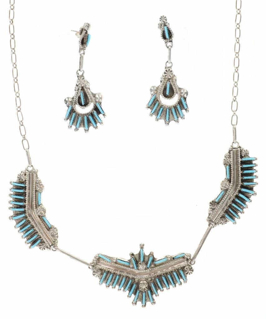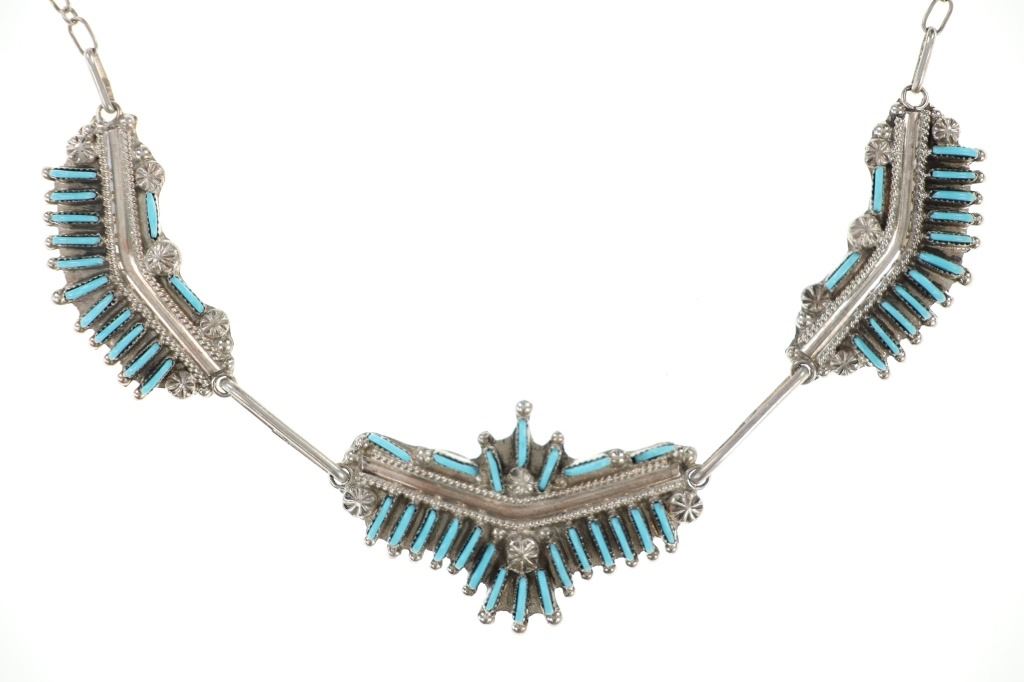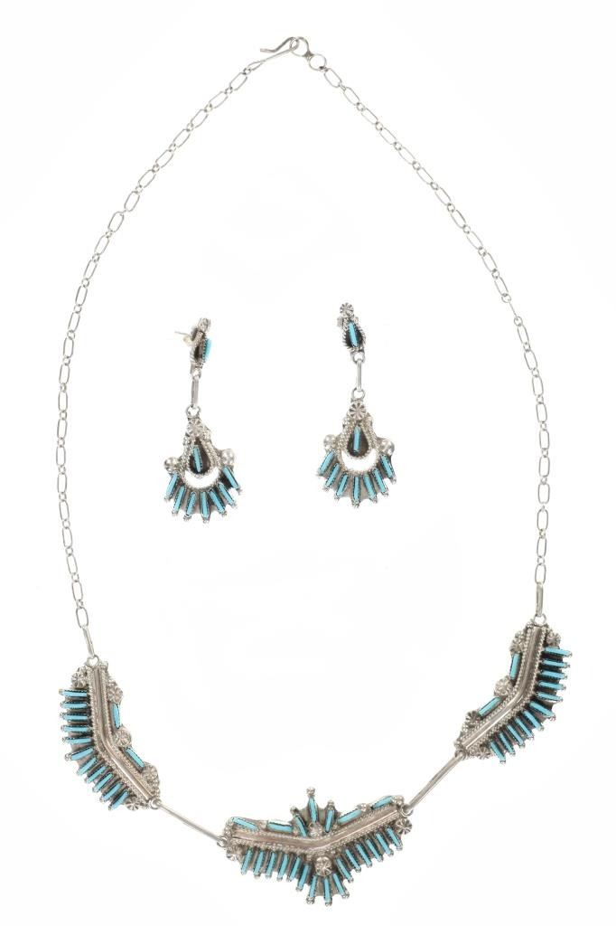 Featured in this lot is this sterling silver petite point turquoise jewelry set from Navajo artist B. Wyaca. There is a necklace and pair of earrings in this collection with a triple setting of sterling silver and petite point turquoise decoration and the earrings show similar decoration with sterling silver and petite point turquoise inlaid on stud earring backings. The necklace is marked as follows: B. Wyaca. The condition of this Navajo necklace and earrings is good with no obvious signs of damage and shows good overall condition. The measurements of this necklace from clasp to clasp is 21 3/8" and the central pendant measures 1 3/8" x 2 1/8" and the earrings measure 2 1/8" x 7/8". The collective weight of this jewelry is 40.4g.