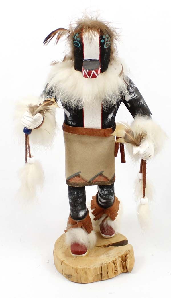 Native American Navajo Badger Kachina by E. Tom, measures 11.25''H x 6''W x 5.5''Deep and is signed on the bottom, embellished with rabbit fur, leather, feathers, and beads