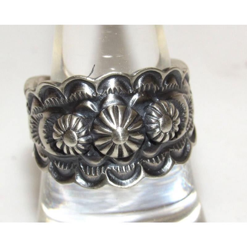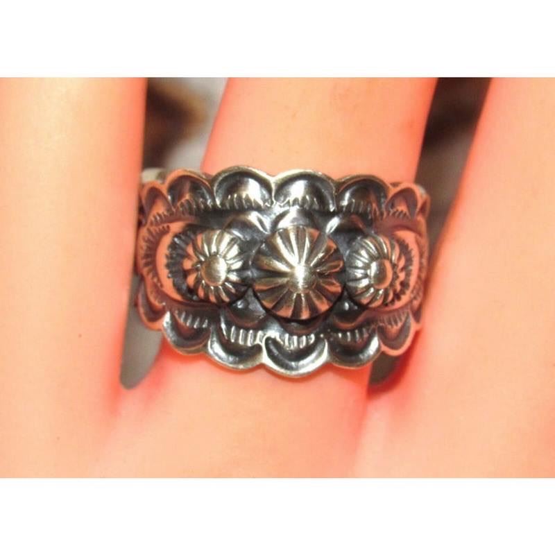 Gorgeous Native American Navajo sterling silver intricately hand etched and stamped tribal design band ring with repousse accents on the front. Collectible Navajo artist Bennie Ramone. Wonderful craftsmanship and attention to detail, intricately hand stamped tribal design. The ring is size 9. Measures about 1/2" wide at the widest point. Stamped sterling, signed by the artist on the inside. Wonderful example of wearable Native American art to add to any jewelry collection. FREE SHIPPING ON ALL JEWELRY ORDERS WITHIN THE US! WE SHIP ALL ITEMS IN-HOUSE!