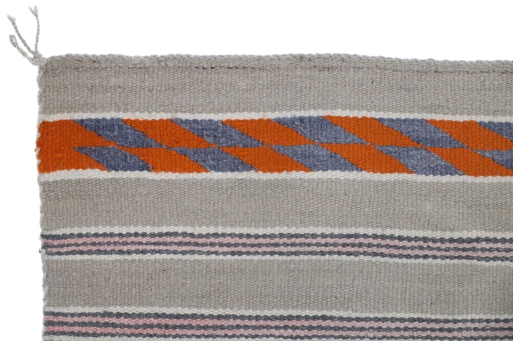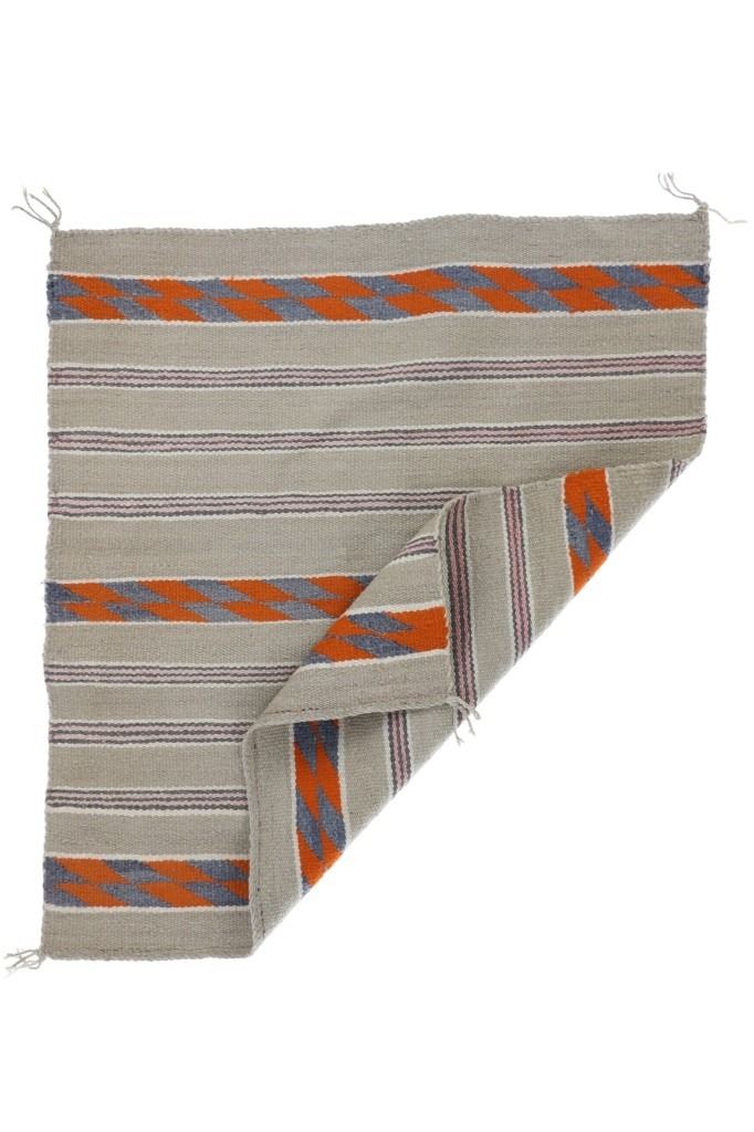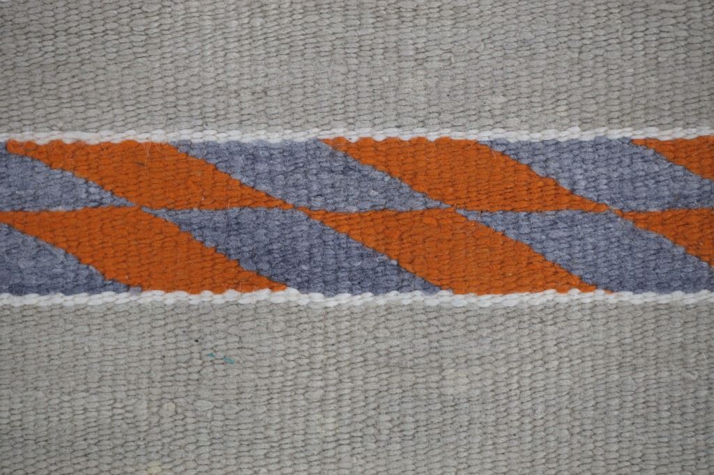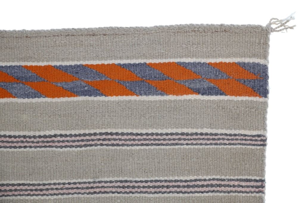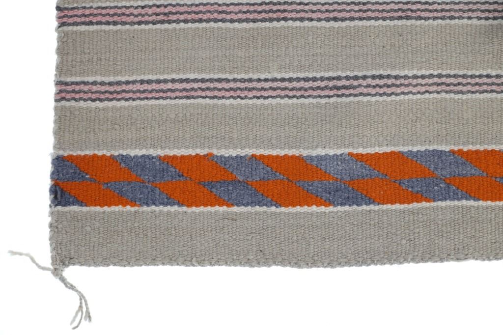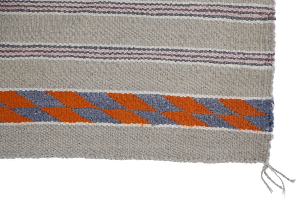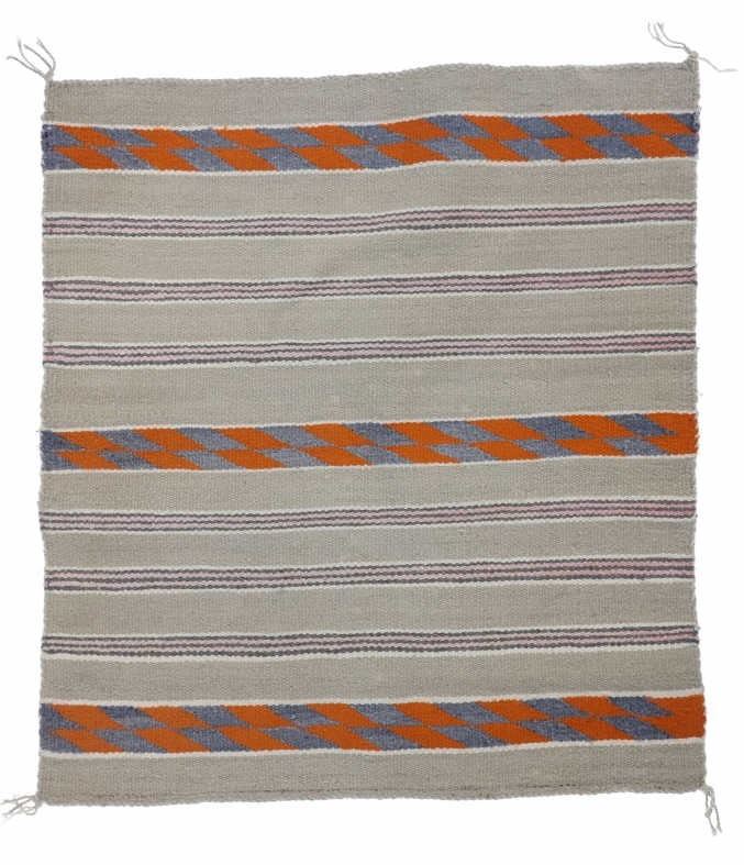 Featured in this lot is this Navajo banded Chinle Trading Post rug circa 1960's collected from Fort Defiance 1960's. Provenance: The collectors grandmother and grand father were homesteaders in Hesperus, Colorado in the late 1800's and her daughter bout this rug from Fort Defiance Trading Post in 1960's. The rug features a wonderfully and professionally crafted wool construction that shows a Chinle design with a light brown field and bands of off white, Cheyenne Pink, Pumpkin Orange, and dark grey. The condition of this Navajo rug is well preserved with no obvious signs of damage and shows a well preserved overall condition. The measurements of this rug is 30 1/4" x 27 1/4". The thread count of this rug is 150 threads per square inch.