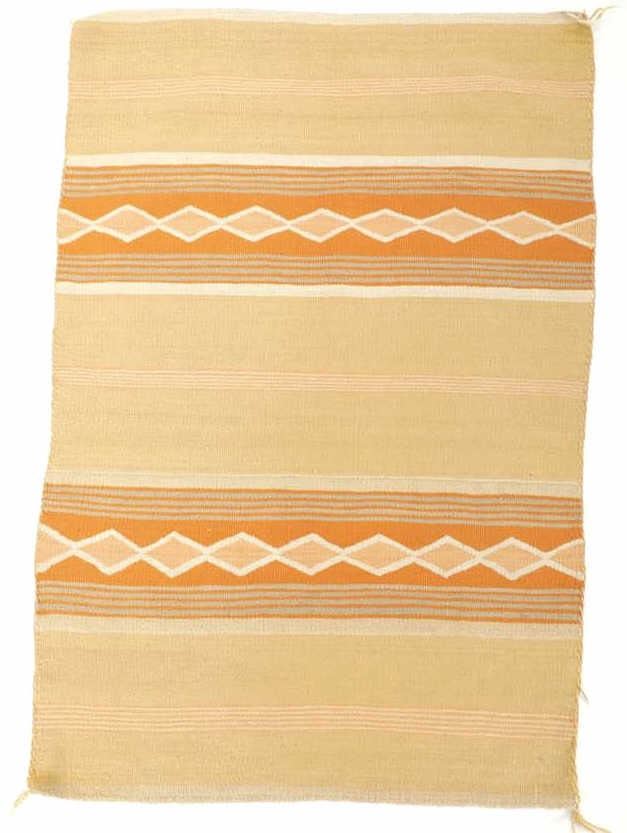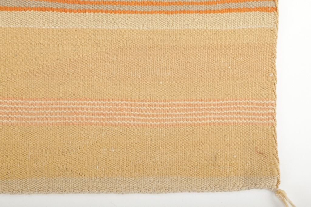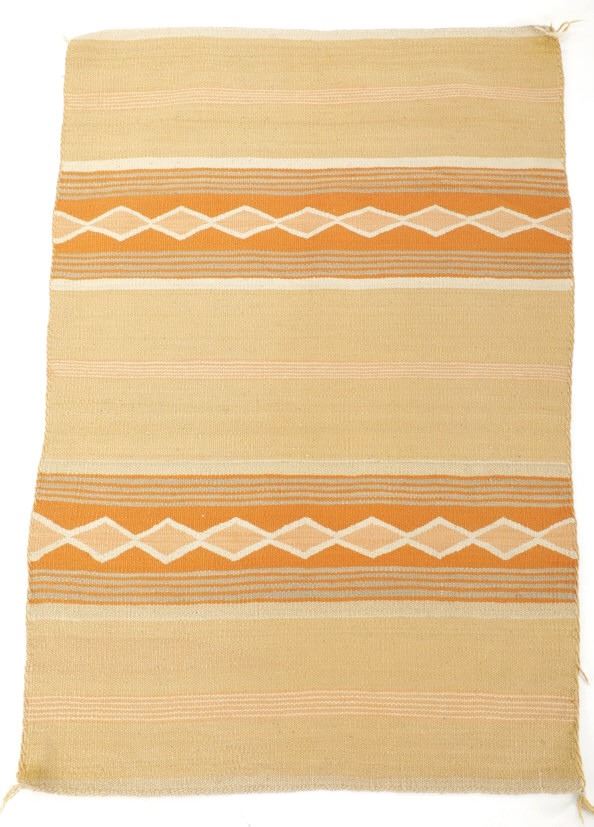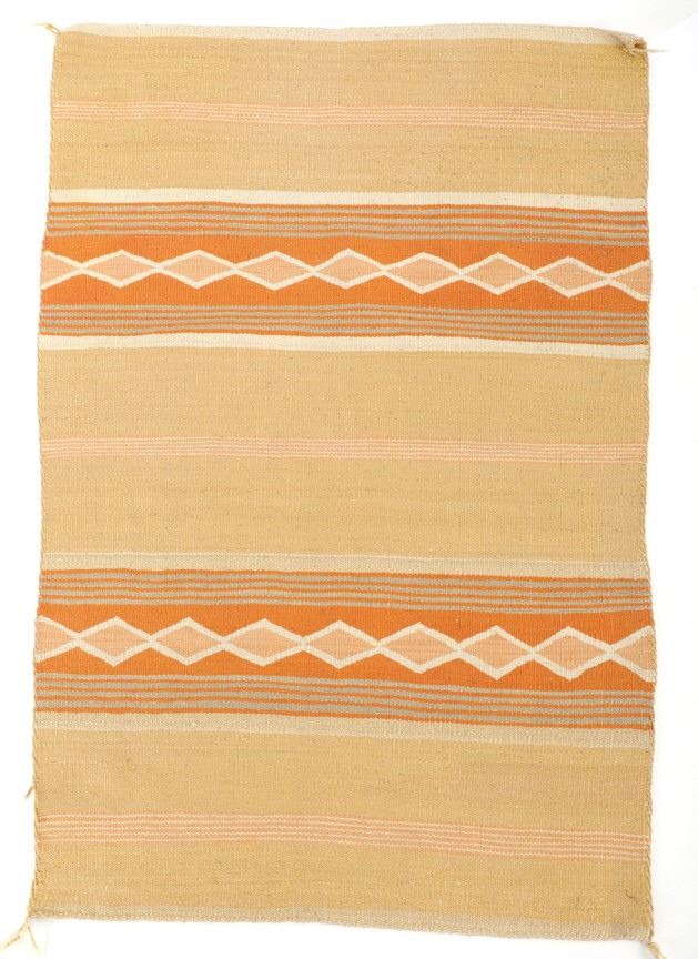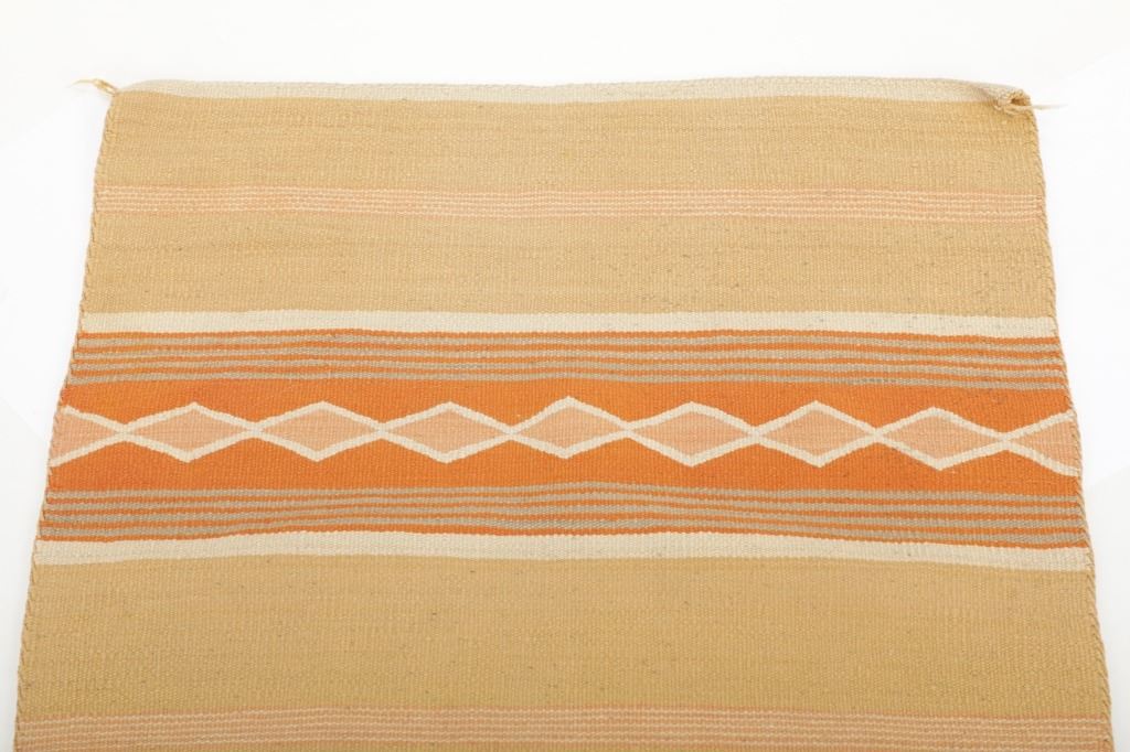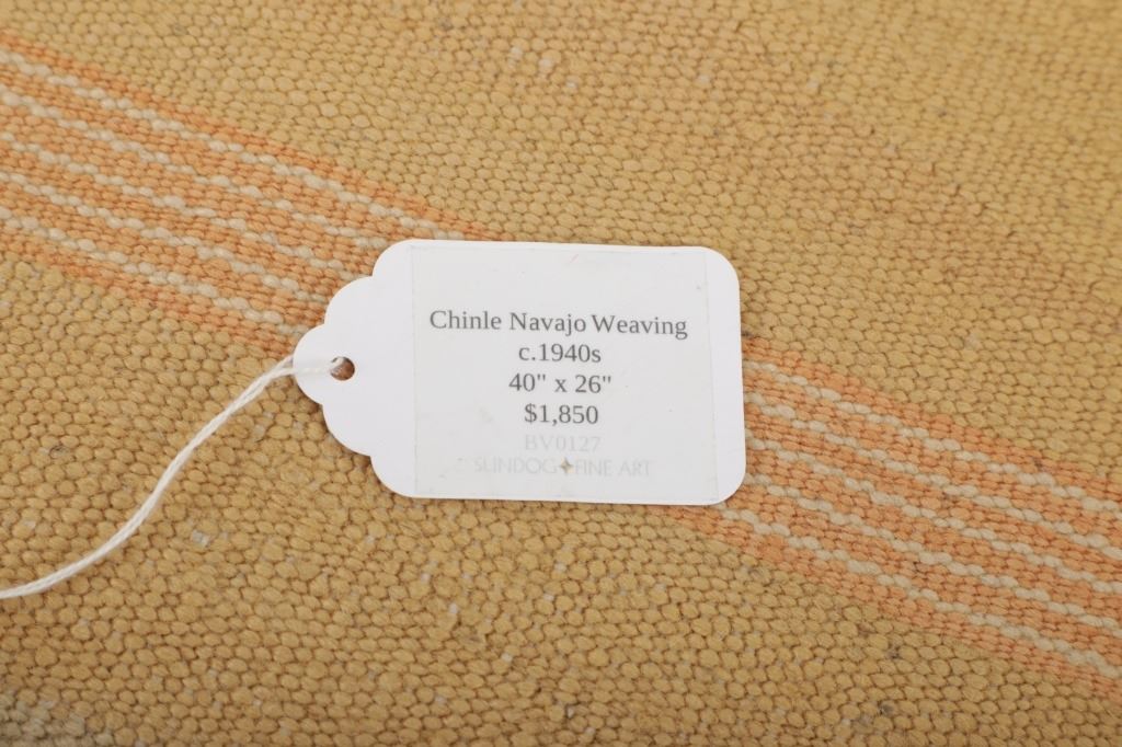 Featured in this lot is this Navajo banded Chinle wool rug circa 1940's. The rug features a wonderfully and professionally woven wool construction that features a lovely banded design that shows geometric patterns throughout the two larger bands towards the center of the rug and includes light and dark orange coloration with yellow banded colors and a off white border to the geometric patterns. The thread count is 130 threads per square inch. The condition of this Navajo Chinle rug is good with no obvious signs of damage and shows good overall condition. The measurements of this Navajo Chinle rug is 40" x 26". Provenance: From the renowned Sundog Fine Art Bozeman, Montana collection and collected by Bruce VanLandingham. Bruce VanLandingham was a pillar in the American Indian collecting community and a respected expert. Along with being an avid collector, Bruce also was the sole owner of Sundog Fine Art Gallery in Bozeman, which was both part museum and gallery.
