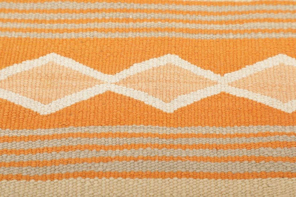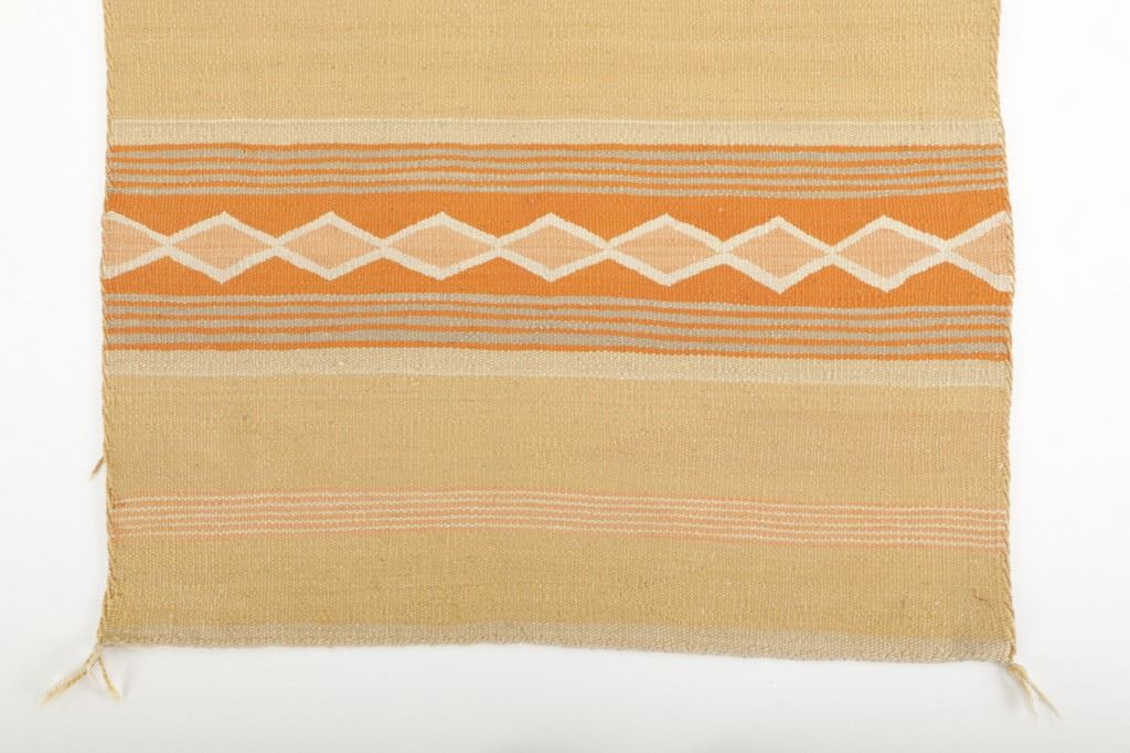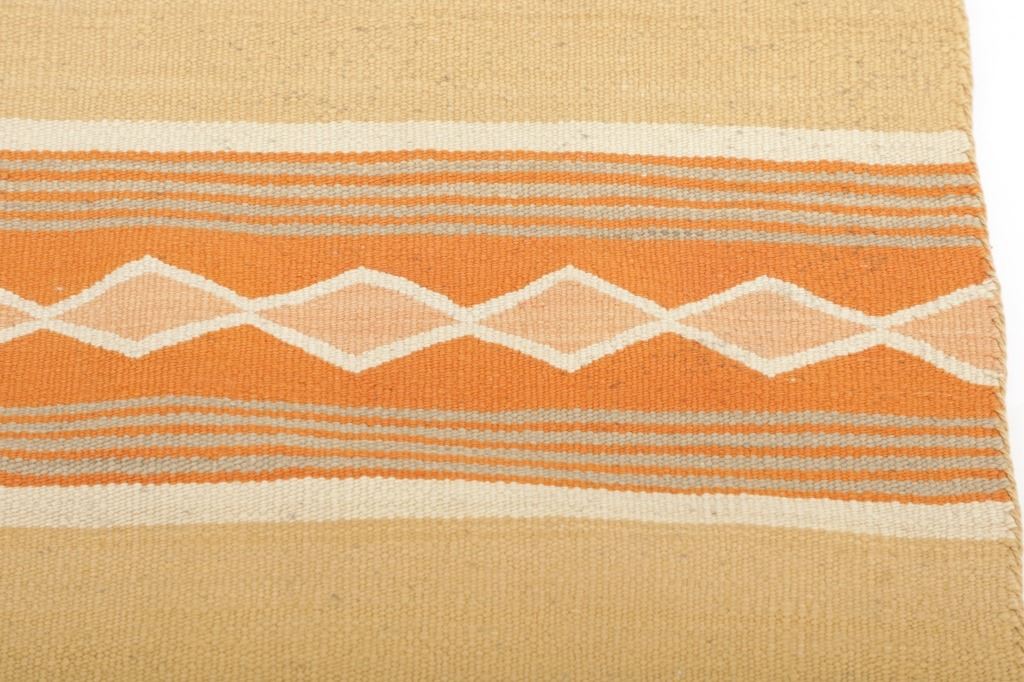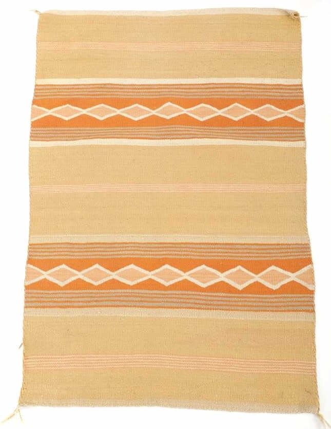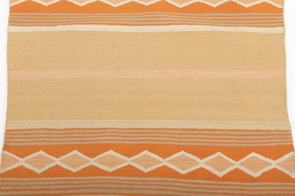 Featured in this lot is this Navajo banded Chinle wool rug circa 1940's. The rug features a wonderfully and professionally woven wool construction that features a lovely banded design that shows geometric patterns throughout the two larger bands towards the center of the rug and includes light and dark orange coloration with yellow banded colors and a off white border to the geometric patterns. The thread count is 130 threads per square inch. The condition of this Navajo Chinle rug is good with no obvious signs of damage and shows good overall condition. The measurements of this Navajo Chinle rug is 40" x 26". Provenance: From the renowned Sundog Fine Art Bozeman, Montana collection and collected by Bruce VanLandingham. Bruce VanLandingham was a pillar in the American Indian collecting community and a respected expert. Along with being an avid collector, Bruce also was the sole owner of Sundog Fine Art Gallery in Bozeman, which was both part museum and gallery.