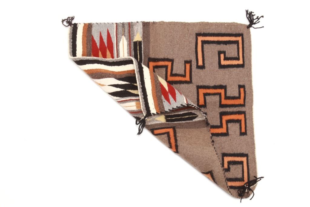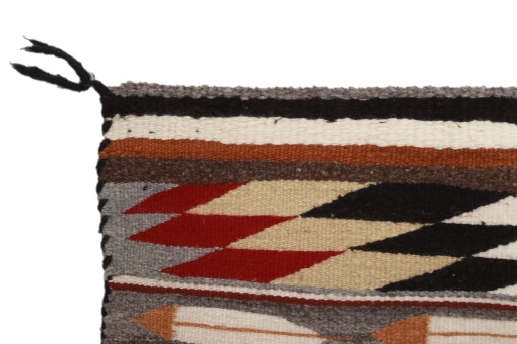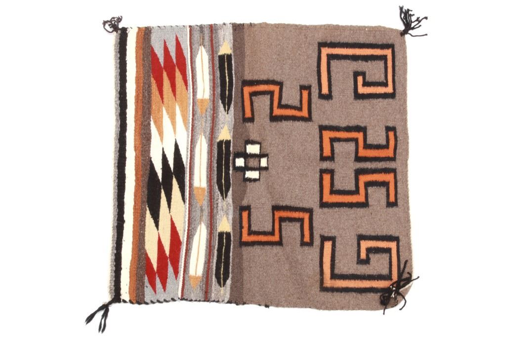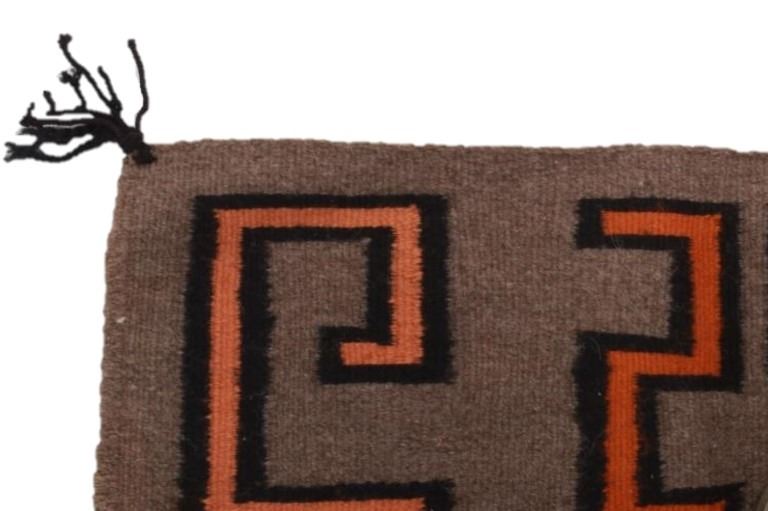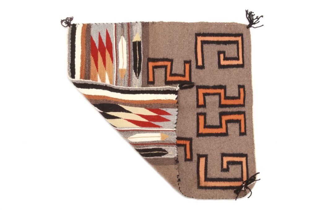 Featured in this lot is this Navajo banded pictorial salesman sample rug, circa 1960's. The rug shows a banded crystal design with arrow fletching pictorial design shown in the center and stepped half whirling log design set to a light grey field. The coloration of the bands and pictorial segments of this rug are off-white, black, light grey, light brown cream, and medium red. The condition of this rug is good, with no obvious signs of damage. The measurements of this rug are 27 1/4" x 26 1/2".