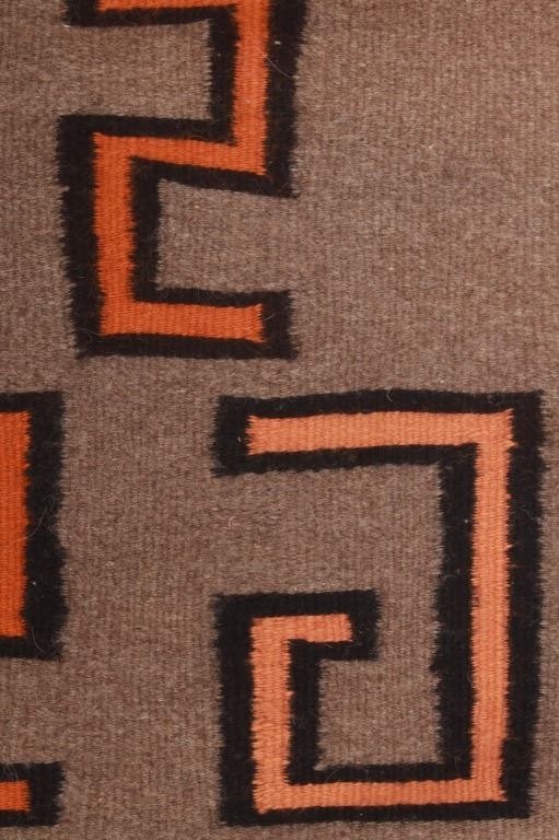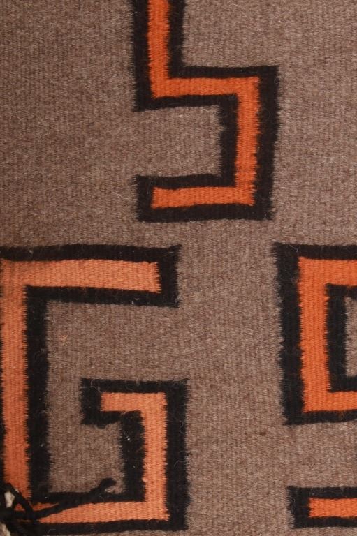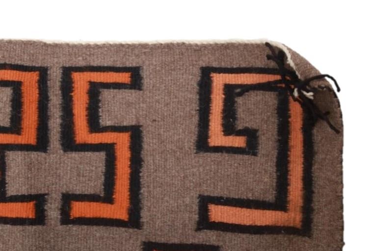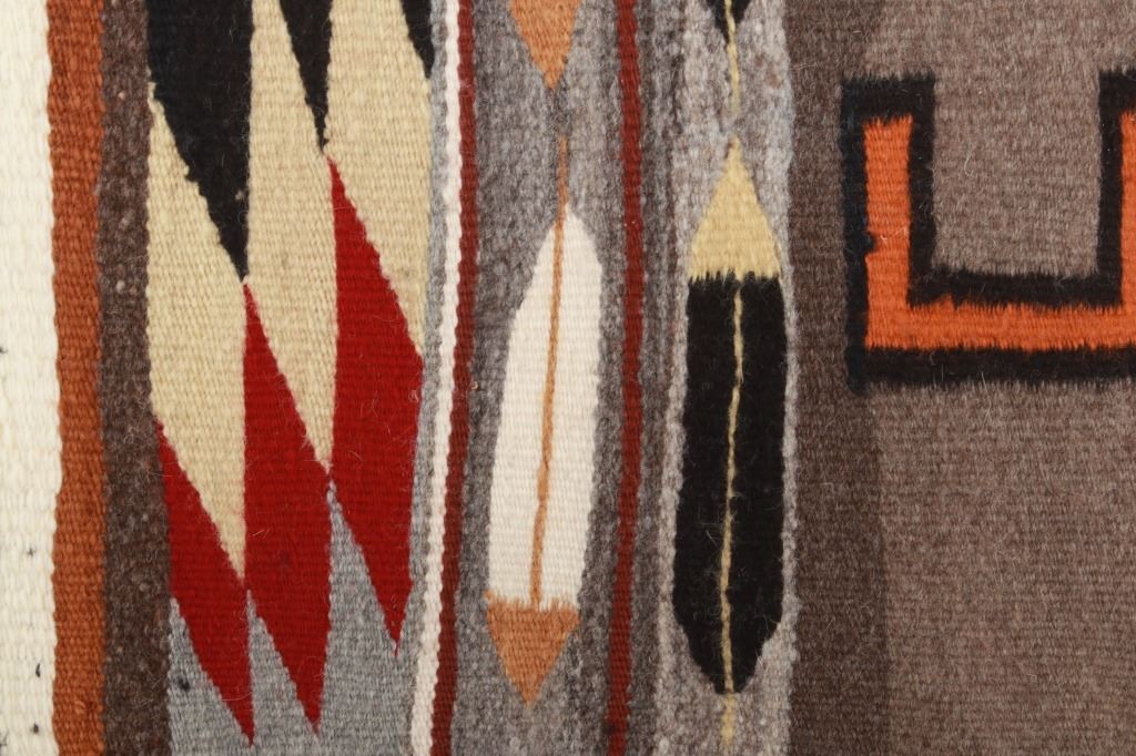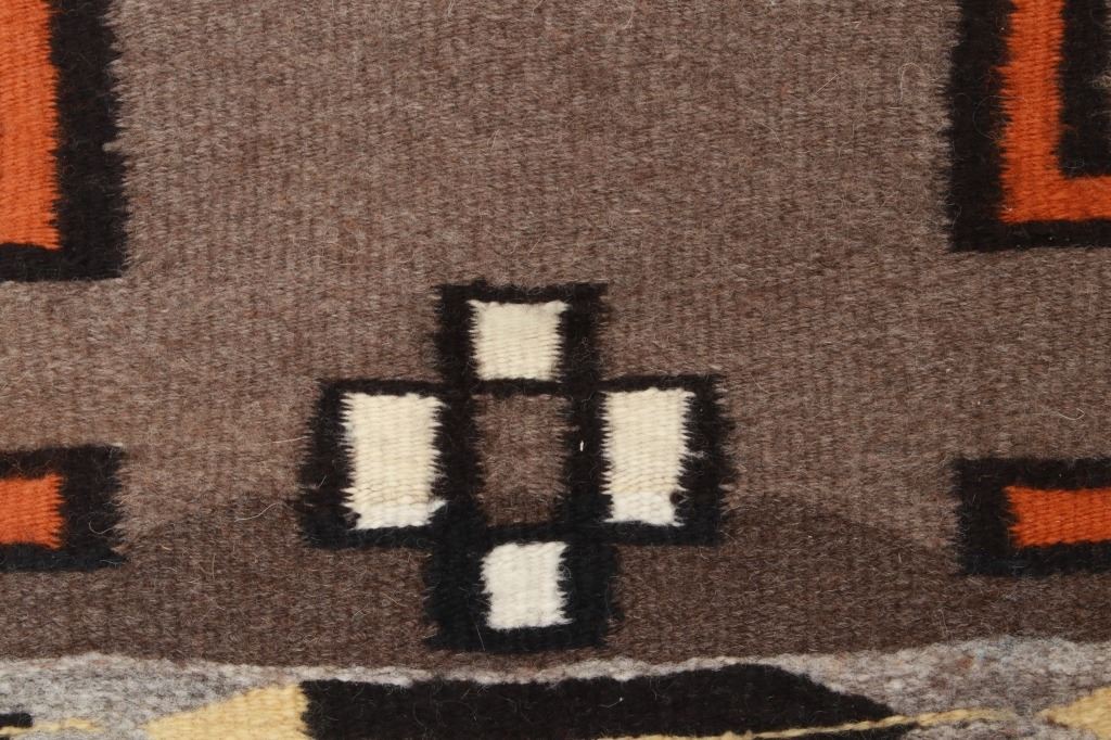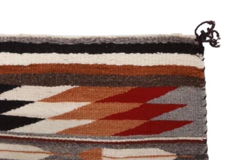 Featured in this lot is this Navajo banded pictorial salesman sample rug, circa 1960's. The rug shows a banded crystal design with arrow fletching pictorial design shown in the center and stepped half whirling log design set to a light grey field. The coloration of the bands and pictorial segments of this rug are off-white, black, light grey, light brown cream, and medium red. The condition of this rug is good, with no obvious signs of damage. The measurements of this rug are 27 1/4" x 26 1/2".