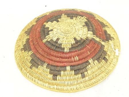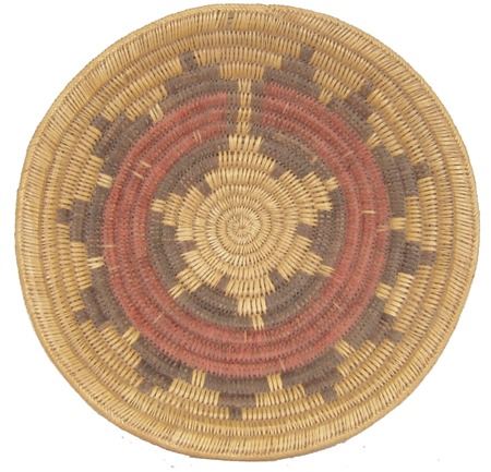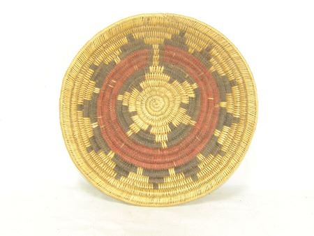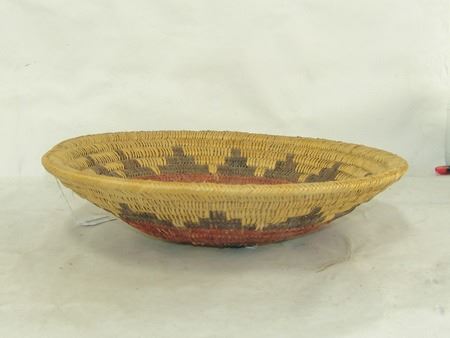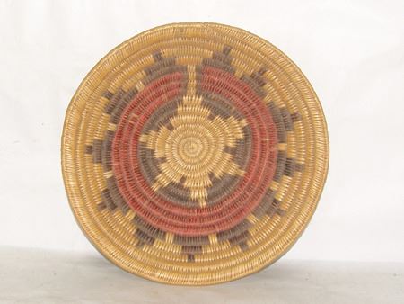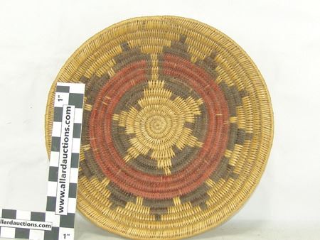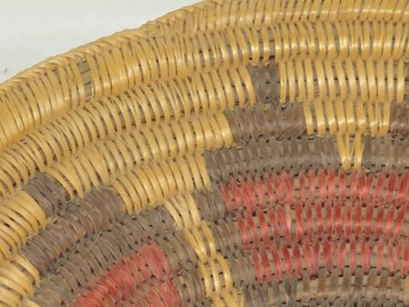 Ca. 1980s, A classic sturdy weave basketry bowl done in traditional wedding basket design, done in traditional purple and red wedding basket design. Very good condition. 4" x 16"
