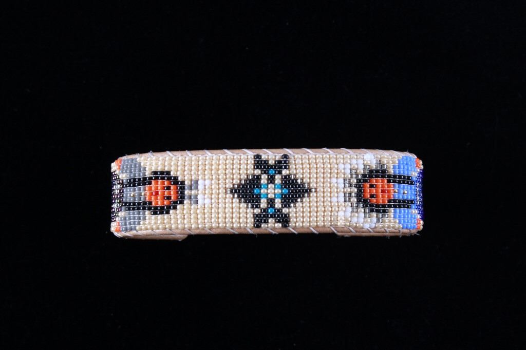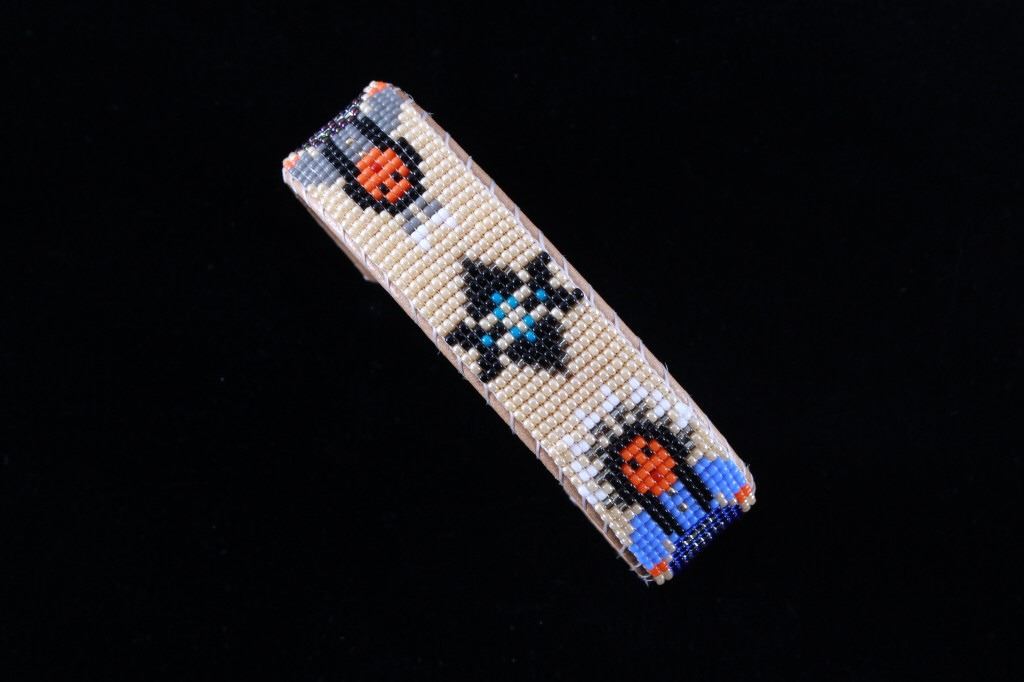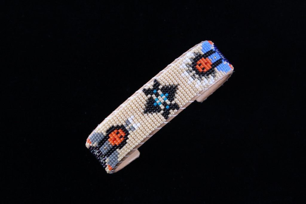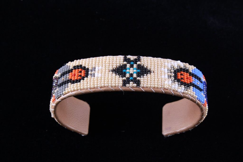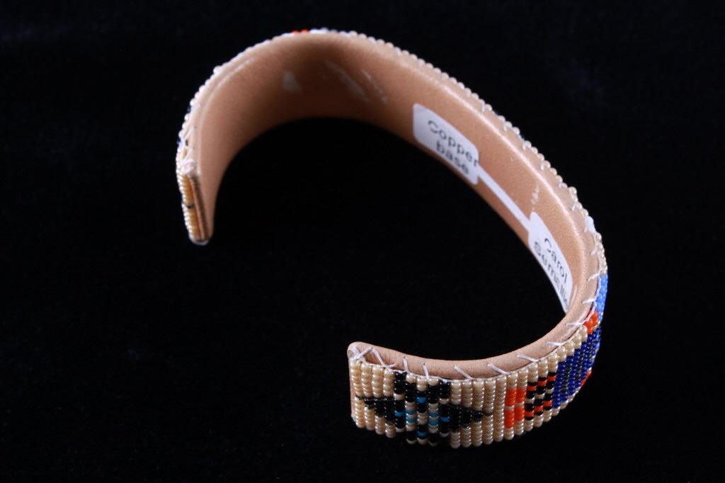 The bracelet is by Navajo Native American artist Carol Semallie and exhibits a copper bracelet cuff covered in hide and artfully finished with loom beaded beadwork. The beadwork is done in all glass trade seed beads showing geometric and Native American warrior and chief human effigy figures. The bracelet has a sticker from the artist on the inside stating the copper base and artist name. Good condition. Measures 7.5"L inside circumference wrist size which includes the 1 5/8"W opening.