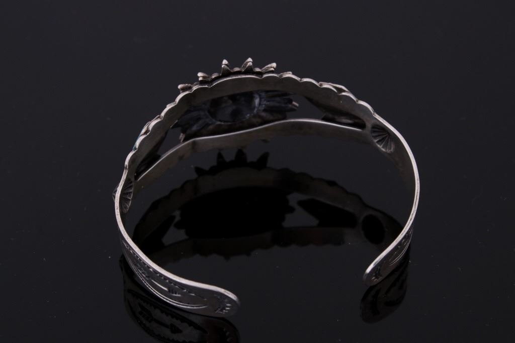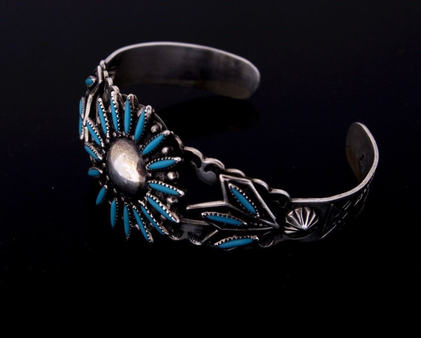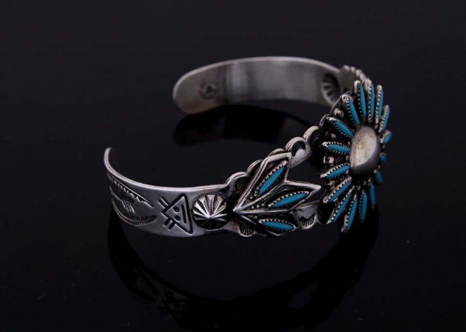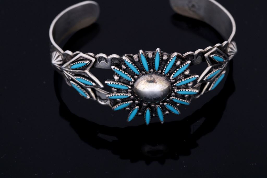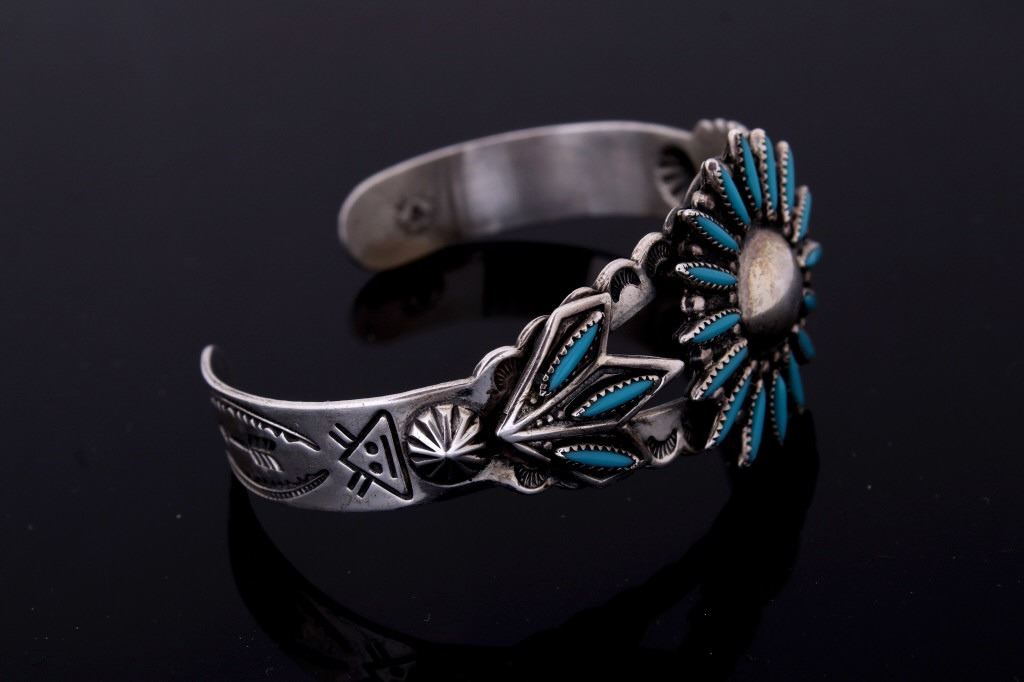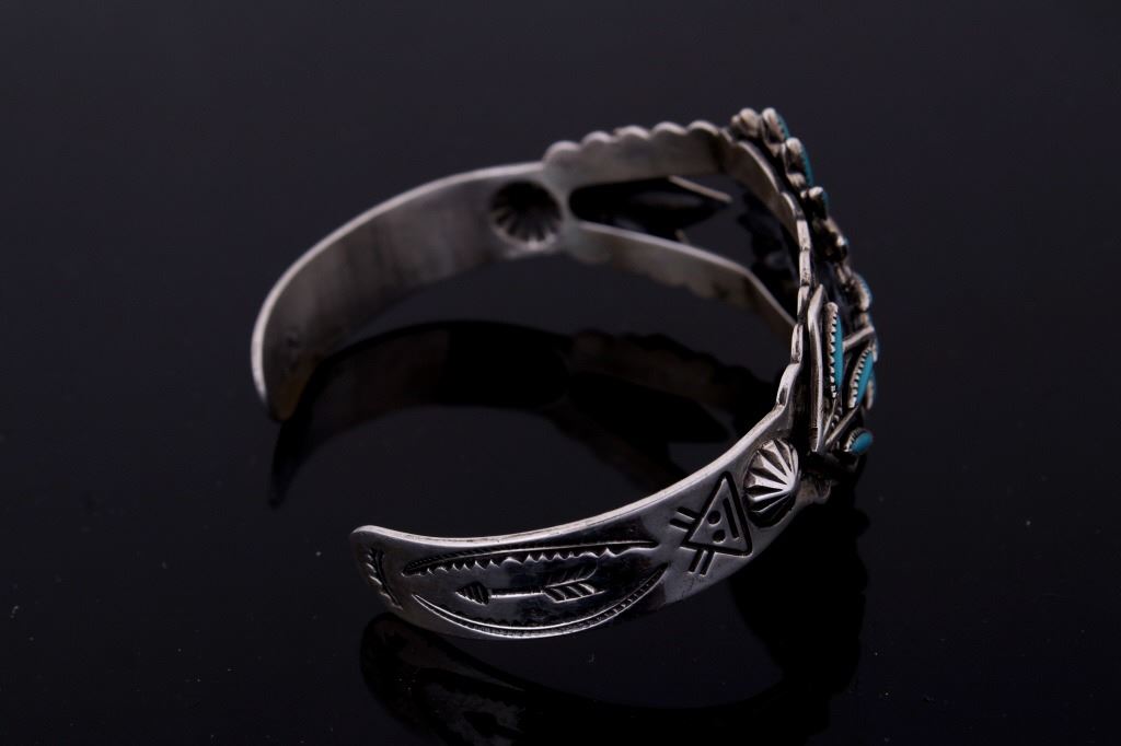 Included in this lot is a Navajo Native American Bell Trading Company petite point bracelet. This stunning bracelet features an incredible applied petite point design as well as repousse features along the sides. Fred Harvey popularized the bracelets and Navajo jewelry sold to Anglo tourist along the Santa Fe railroad lines, in hotels and retail shops. Bell Trading Company followed Harvey's vision selling the same bracelets and jewelry pieces along the famous route 66. This piece is stamped with the Bell Trading Co. hallmark. The interior dimensions of the bracelet measures approximately 6 1/4".