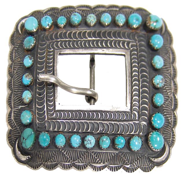 Circa 1970s, Vintage hand wrought heavy silver and turquoise belt buckle, heavily hand stamped and set with 28 Kingman turquoise cabochons - hallmarked A.B. 3" x 3-1/4"
