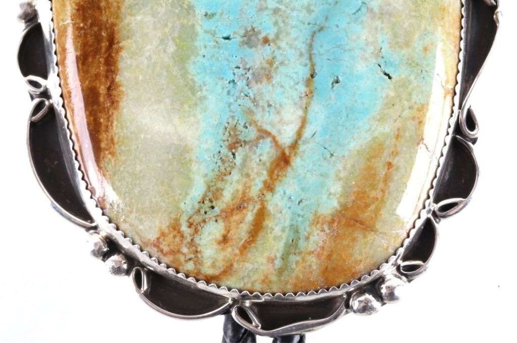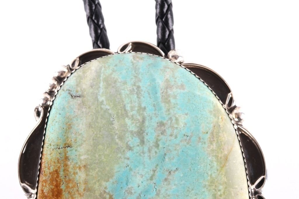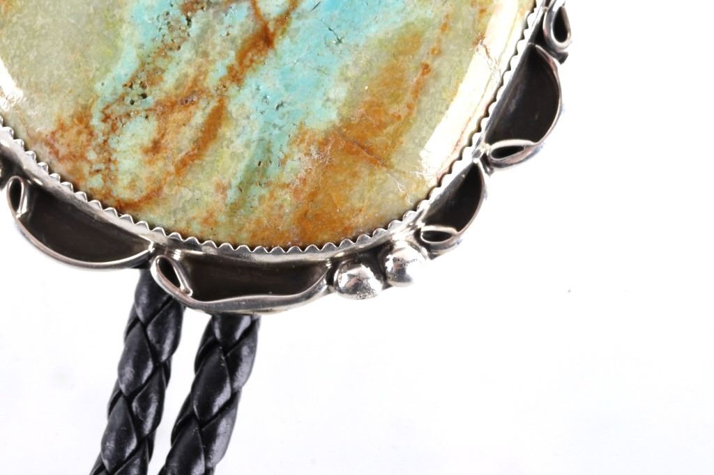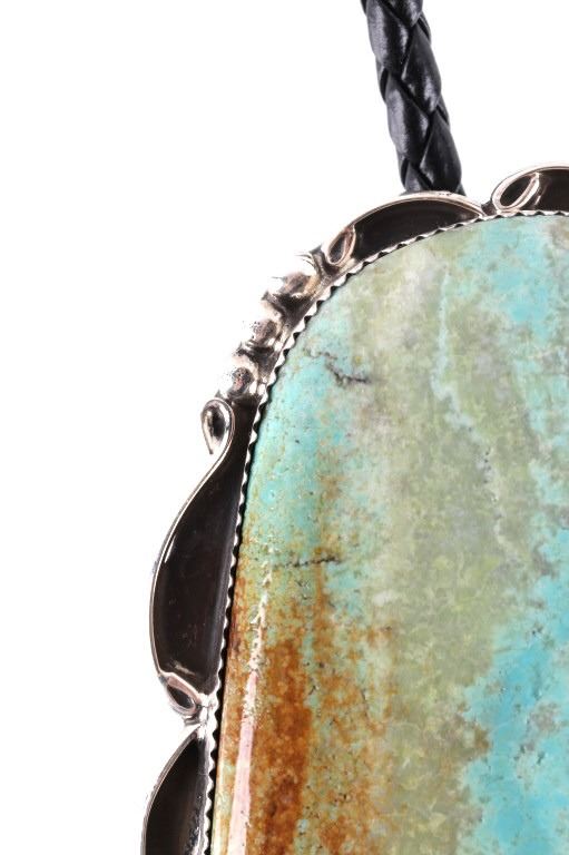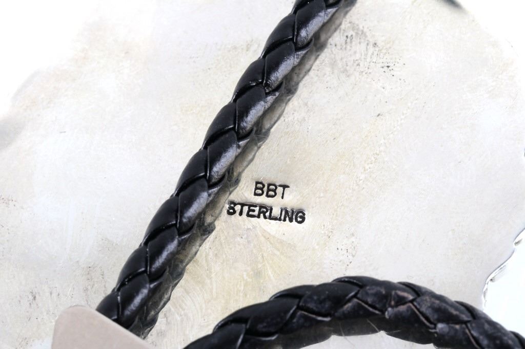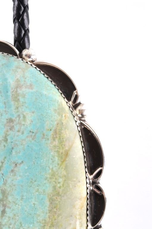 For your consideration is this gorgeous Navajo sterling and Bird's Eye turquoise bolo tie from Navajo silversmith Bernadine Begay Tsosie. The bolo tie features a professionally crafted sterling and turquoise cabochon construction that features a braided leather tie with a four brand plait and is ended with sterling aglets. The central pendant shows a intricate shadow box style decoration that borders a large, oval shaped cabochon of Bird's Eye turquoise that shows a light blue coloration. The pendant is marked on the back, "BBT Sterling", the hallmark for Bernadine Begay Tsosie. The condition of this bolo tie is good with no obvious signs of damage and shows good overall condition. The measurements of this bolo tie from tip to the aglet is 21 1/2" L. The bolo pendant measures 3 7/8" L x 2 1/4" W x 1/2" D. The bolo tie weighs 97.2 grams.