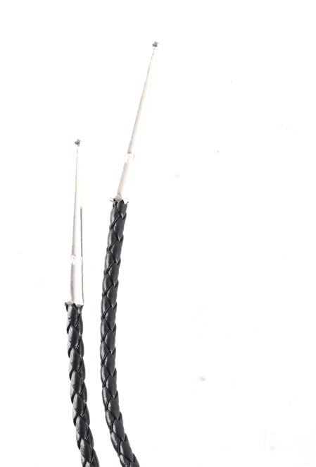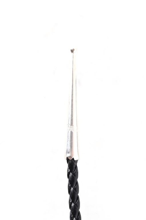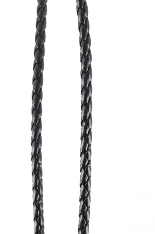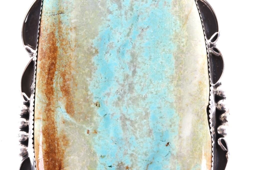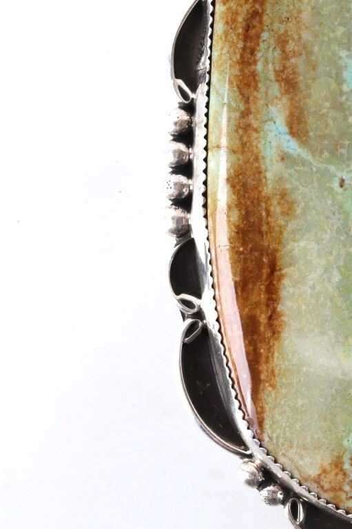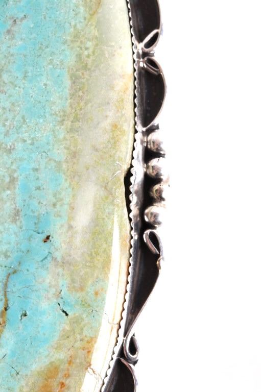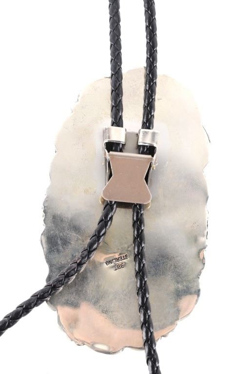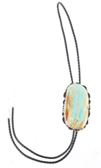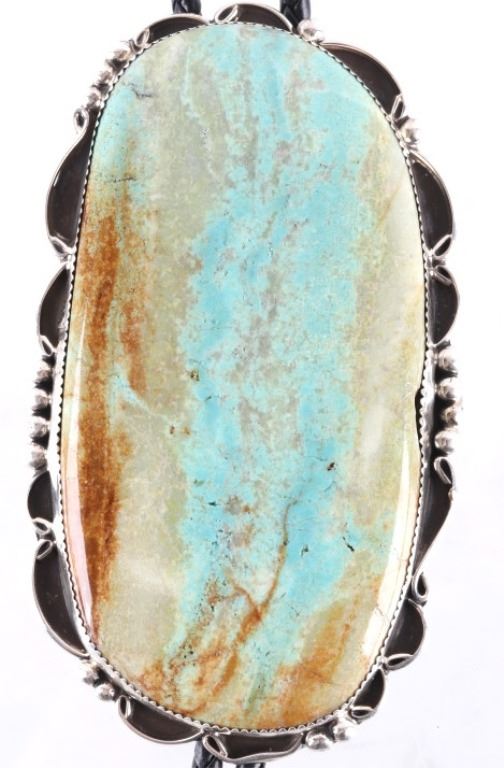 For your consideration is this gorgeous Navajo sterling and Bird's Eye turquoise bolo tie from Navajo silversmith Bernadine Begay Tsosie. The bolo tie features a professionally crafted sterling and turquoise cabochon construction that features a braided leather tie with a four brand plait and is ended with sterling aglets. The central pendant shows a intricate shadow box style decoration that borders a large, oval shaped cabochon of Bird's Eye turquoise that shows a light blue coloration. The pendant is marked on the back, "BBT Sterling", the hallmark for Bernadine Begay Tsosie. The condition of this bolo tie is good with no obvious signs of damage and shows good overall condition. The measurements of this bolo tie from tip to the aglet is 21 1/2" L. The bolo pendant measures 3 7/8" L x 2 1/4" W x 1/2" D. The bolo tie weighs 97.2 grams.