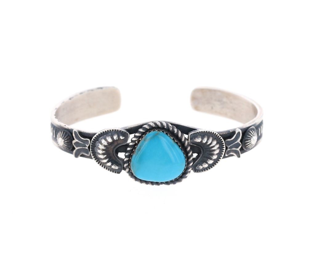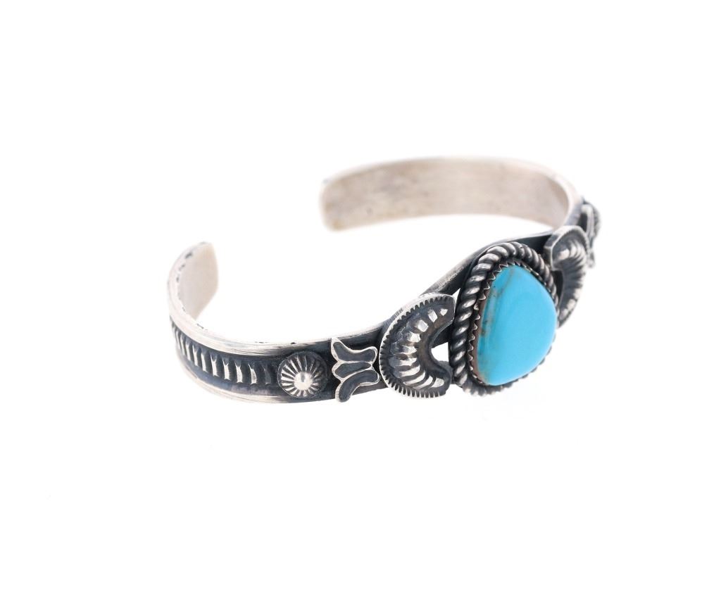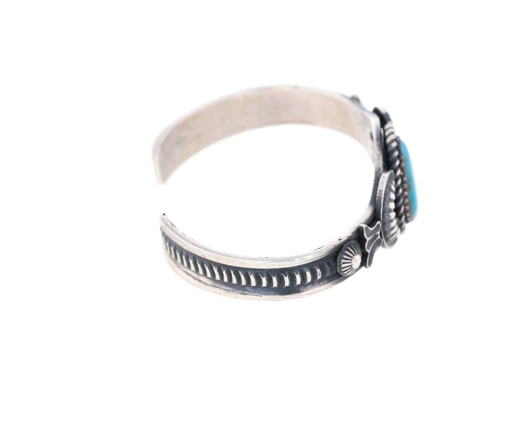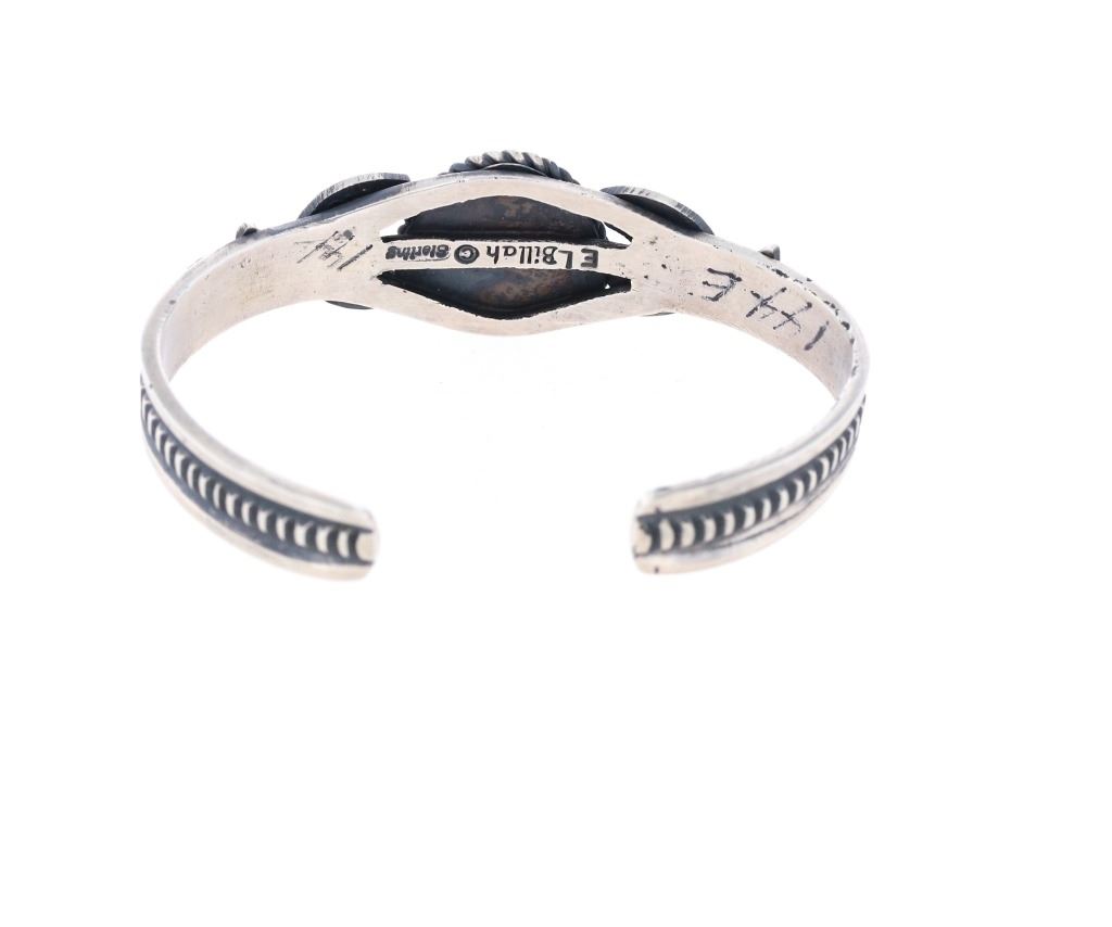 Featured in this lot is this sterling silver and turquoise bracelet from Navajo artist E.L. Billah. The bracelet features a wonderfully and professionally crafted sterling silver construction that features a repousse decoration of twisted rope decoration and added tooled design that shows a center stone of a Kingman turquoise cabochon set into the center. The bracelet is marked 'E.L. Billah and copy right sterling' on the underside of the bracelet. The condition of this bracelet is good with no obvious signs of damage and shows good overall condition. Provenance: From the renowned Sundog Fine Art Bozeman, Montana collection and acquired by Bruce VanLandingham. Bruce VanLandingham was a pillar in the American Indian collecting community and a respected expert. Along with being an avid collector, Bruce also was the sole owner of Sundog Fine Art Gallery in Bozeman, which was both part museum and gallery. The measurements of this bracelet is 1 3/4" x 2 7/8" x 3/4" and the circumference is 4 1/2". The overall weight of this bracelet is 24g.