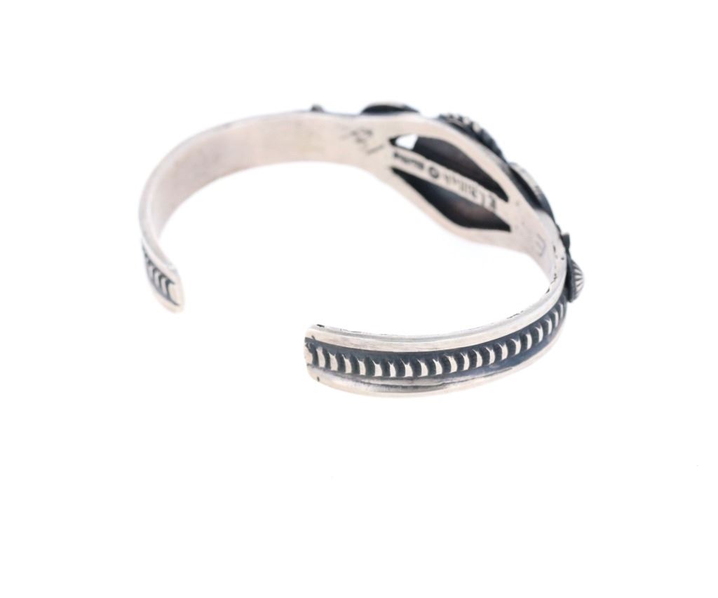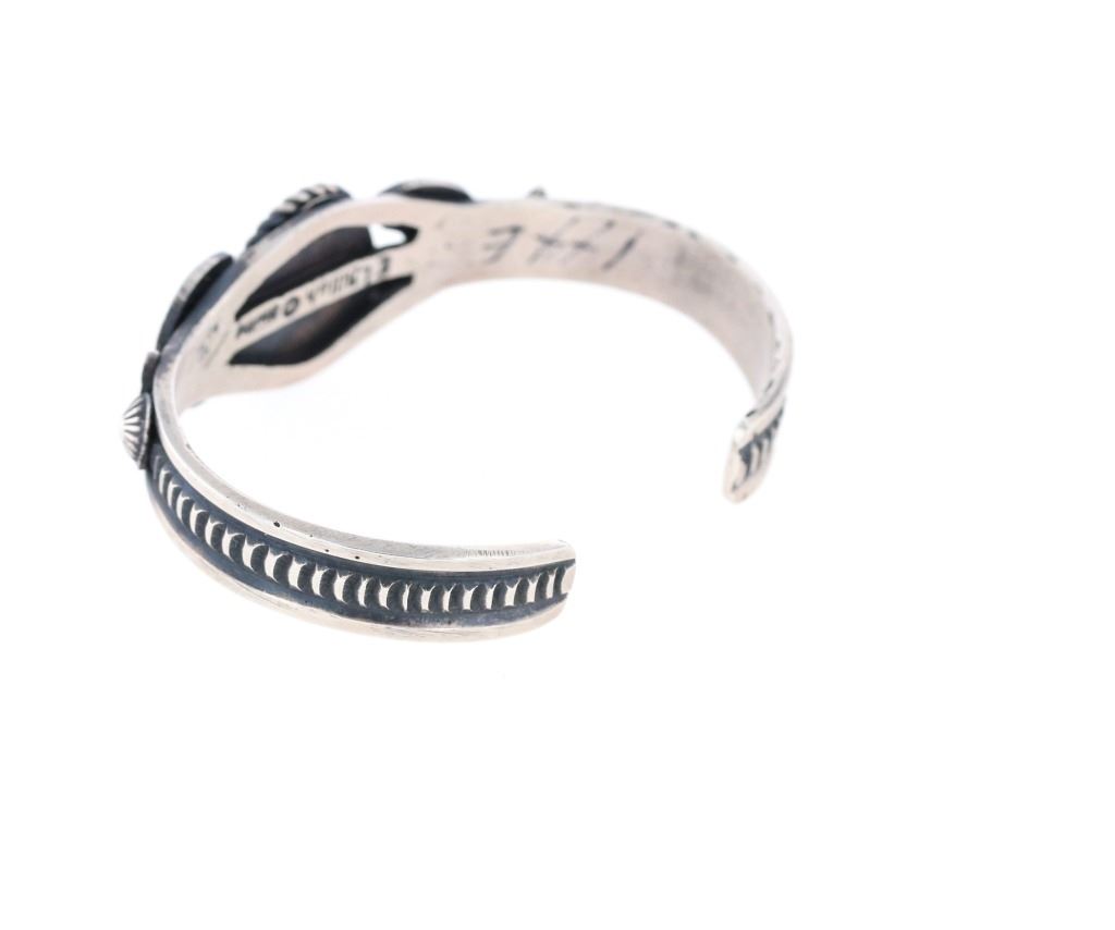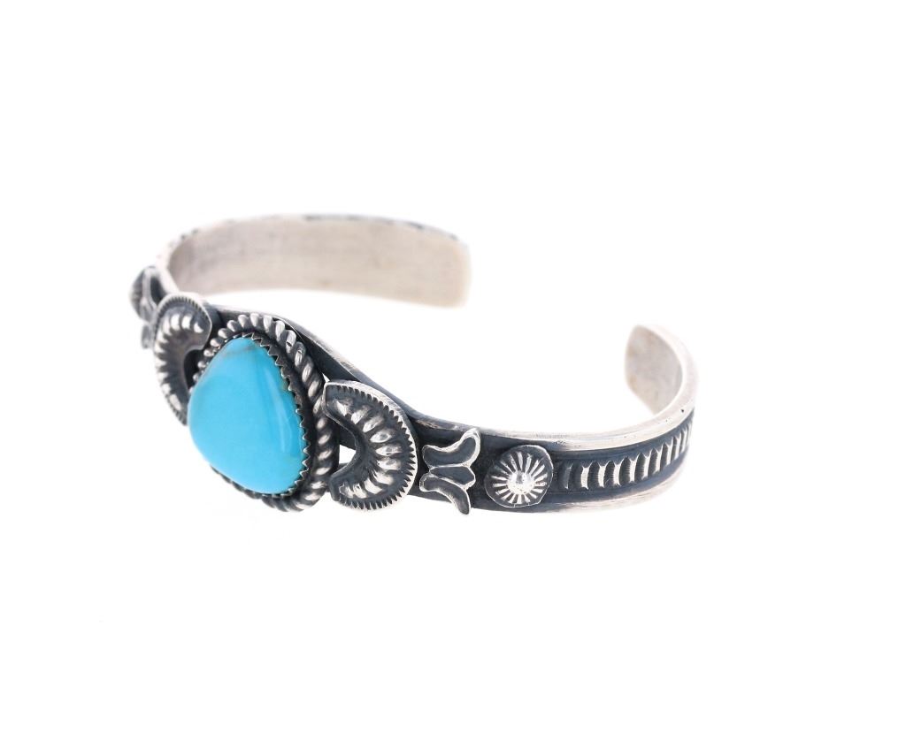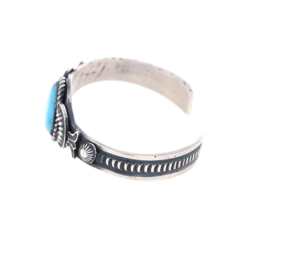 Featured in this lot is this sterling silver and turquoise bracelet from Navajo artist E.L. Billah. The bracelet features a wonderfully and professionally crafted sterling silver construction that features a repousse decoration of twisted rope decoration and added tooled design that shows a center stone of a Kingman turquoise cabochon set into the center. The bracelet is marked 'E.L. Billah and copy right sterling' on the underside of the bracelet. The condition of this bracelet is good with no obvious signs of damage and shows good overall condition. Provenance: From the renowned Sundog Fine Art Bozeman, Montana collection and acquired by Bruce VanLandingham. Bruce VanLandingham was a pillar in the American Indian collecting community and a respected expert. Along with being an avid collector, Bruce also was the sole owner of Sundog Fine Art Gallery in Bozeman, which was both part museum and gallery. The measurements of this bracelet is 1 3/4" x 2 7/8" x 3/4" and the circumference is 4 1/2". The overall weight of this bracelet is 24g.