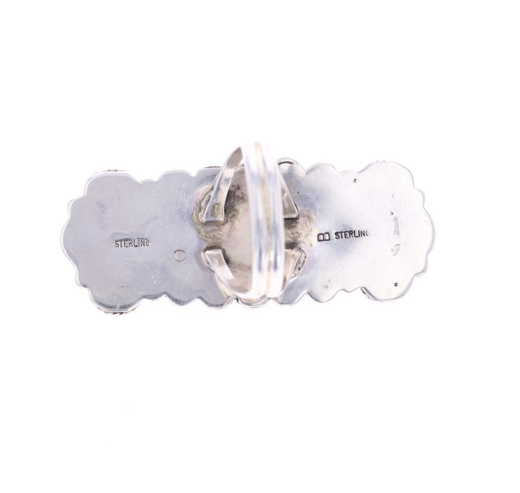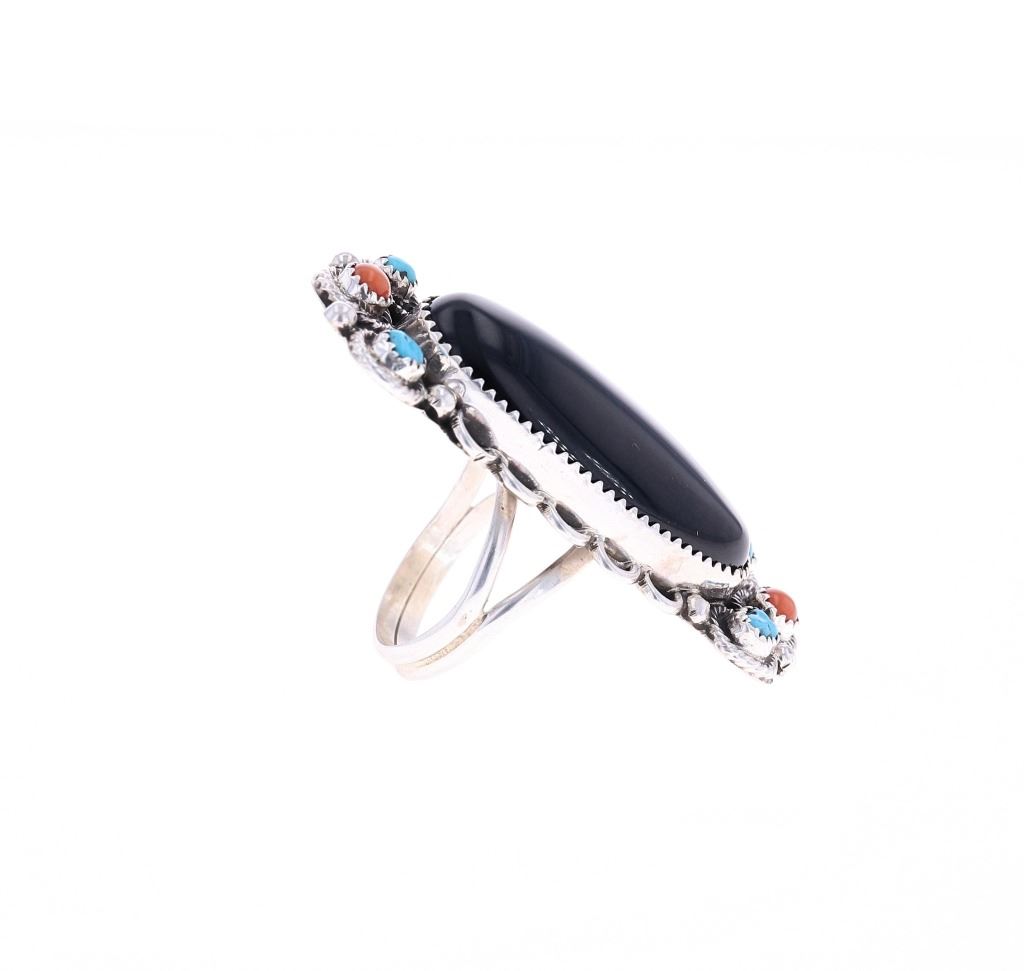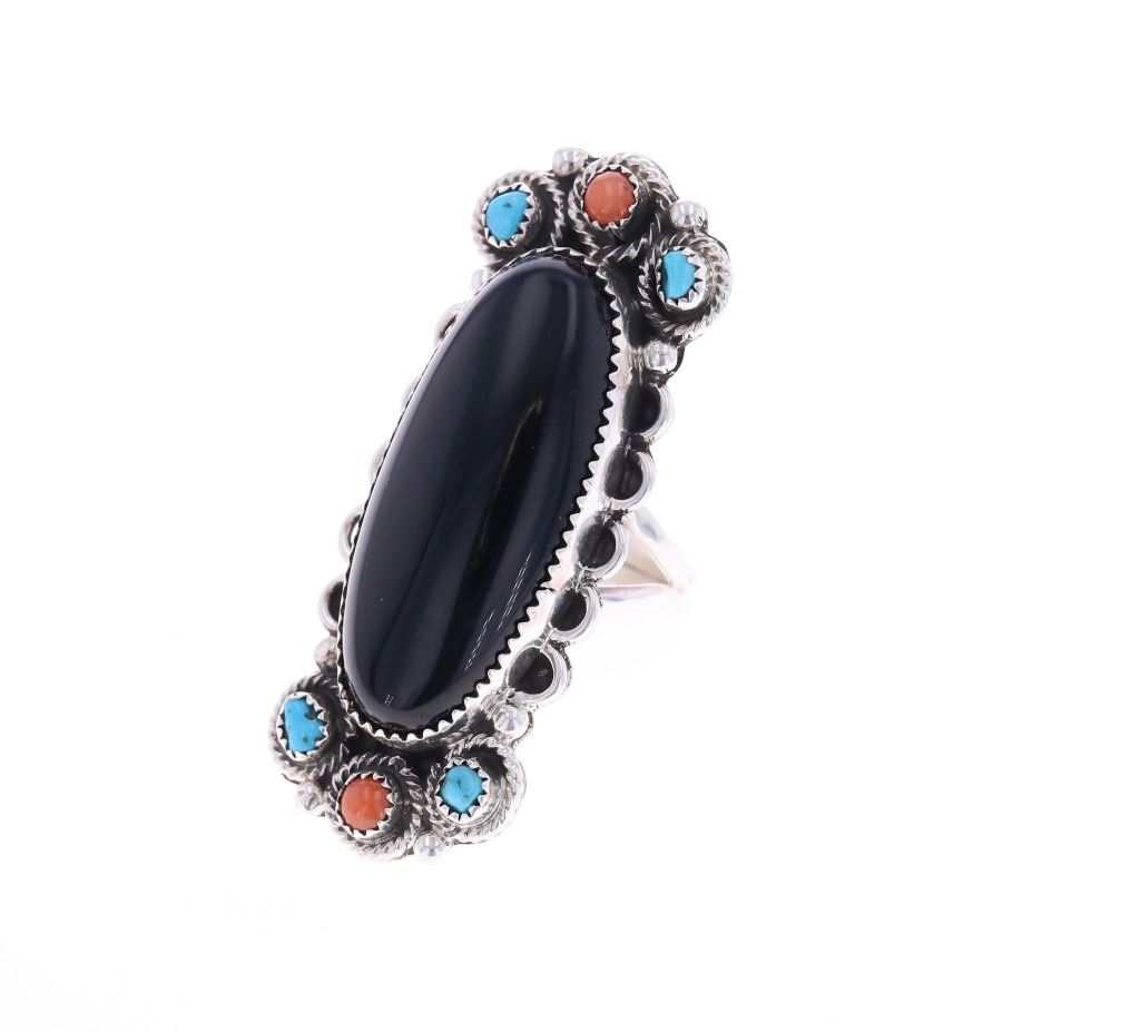 Featured in this lot is this sterling silver, jet, and turquoise ring from Navajo artist Billy Slim. The ring features a wonderfully and professionally crafted sterling silver, jet, and turquoise construction that shows a split shoulder ring band with a central oval jet cabochon with four turquoise cabochon and two red branch coral cabochon set into the ends of the ring. The ring is marked as follows: B - Sterling. The condition of this Navajo ring is good with no obvious signs of damage and shows good overall condition. The measurements of this ring is 1 1/8" x 2" x 3/4" and the ring size is US 9 1/4". The collective weight of this ring is 16.8g.