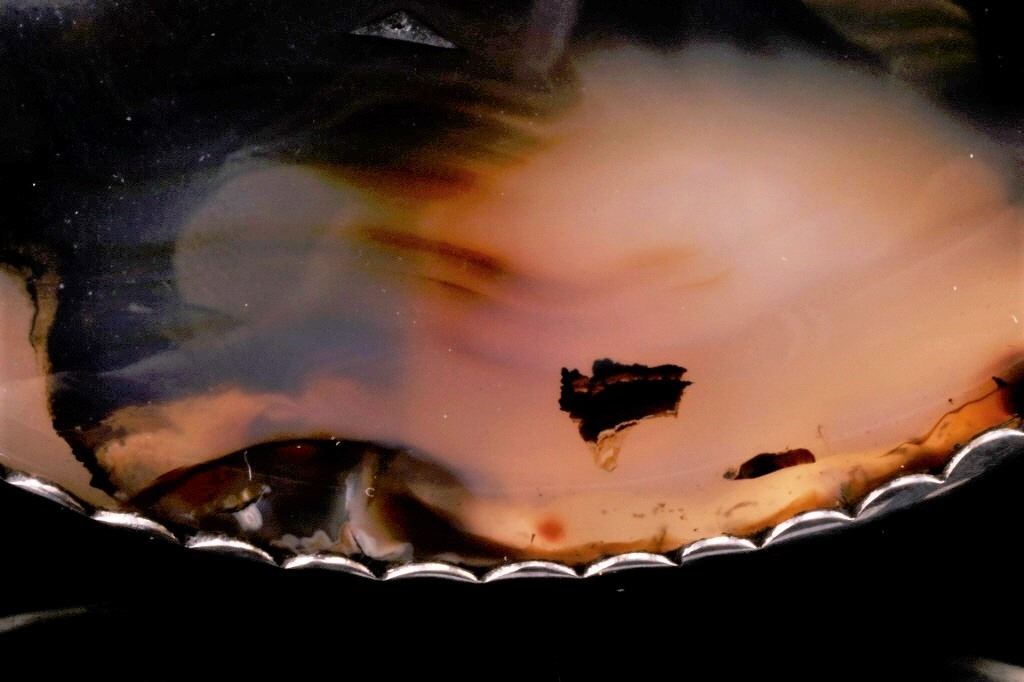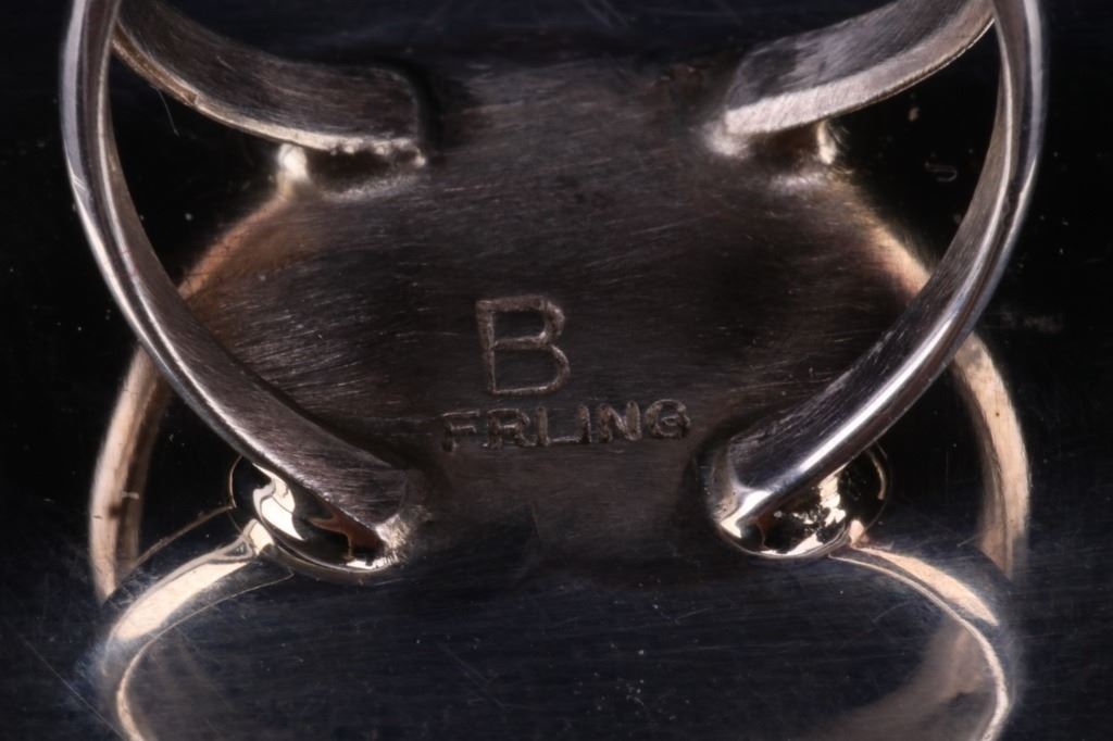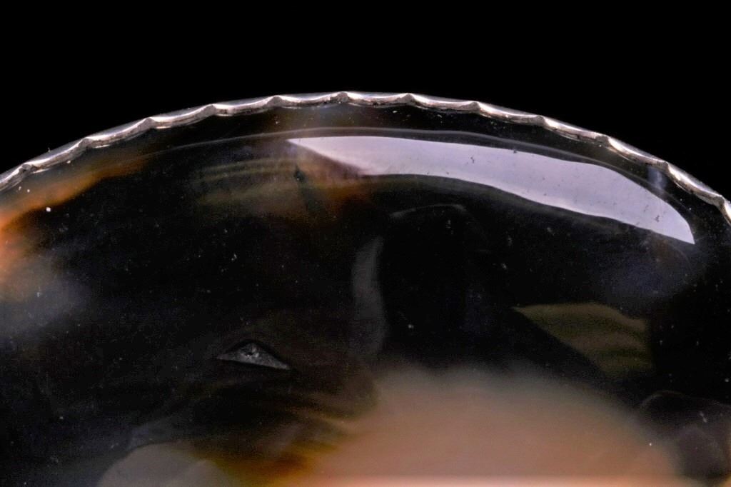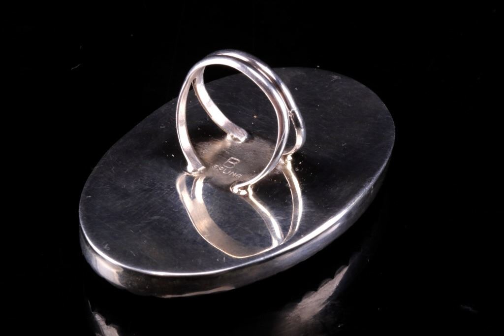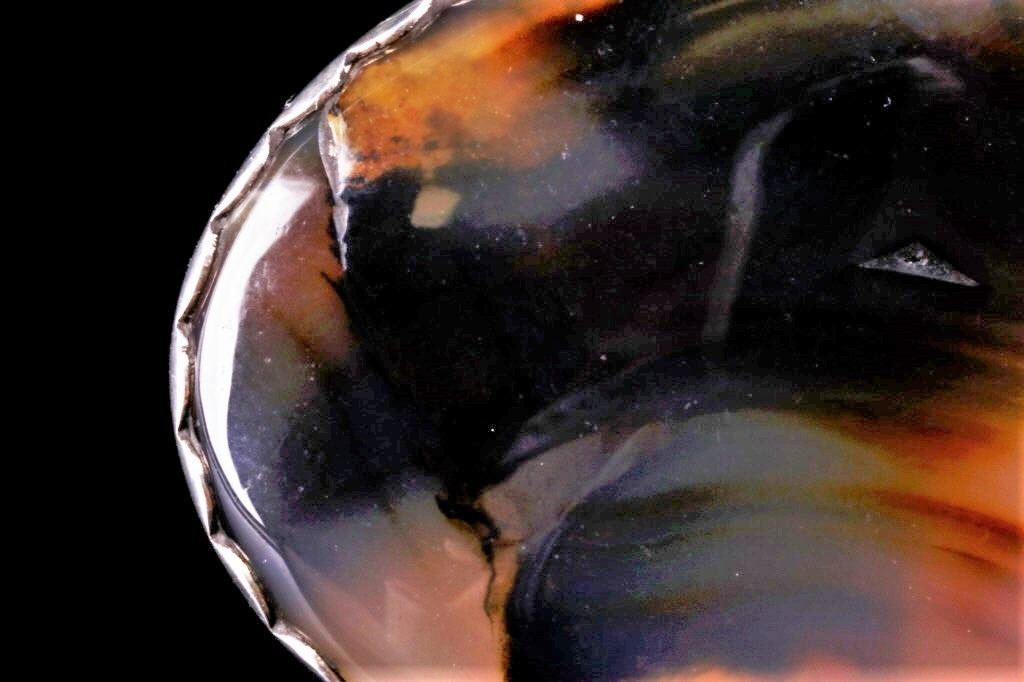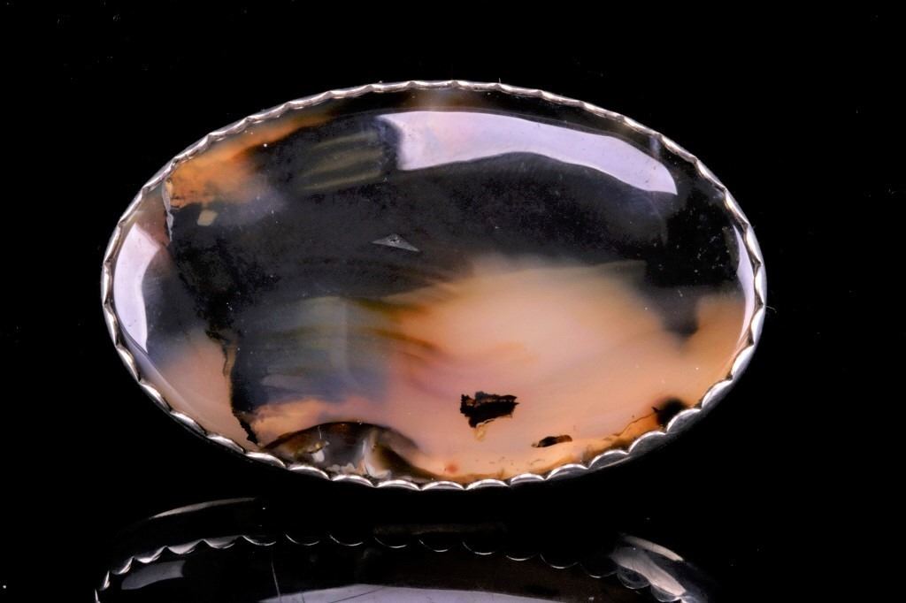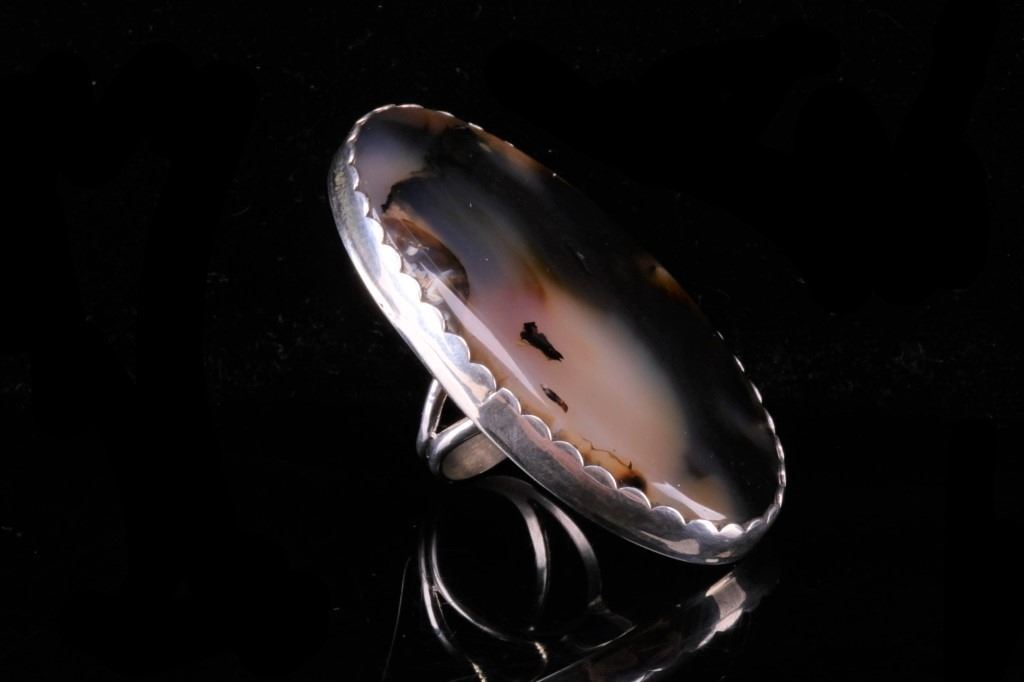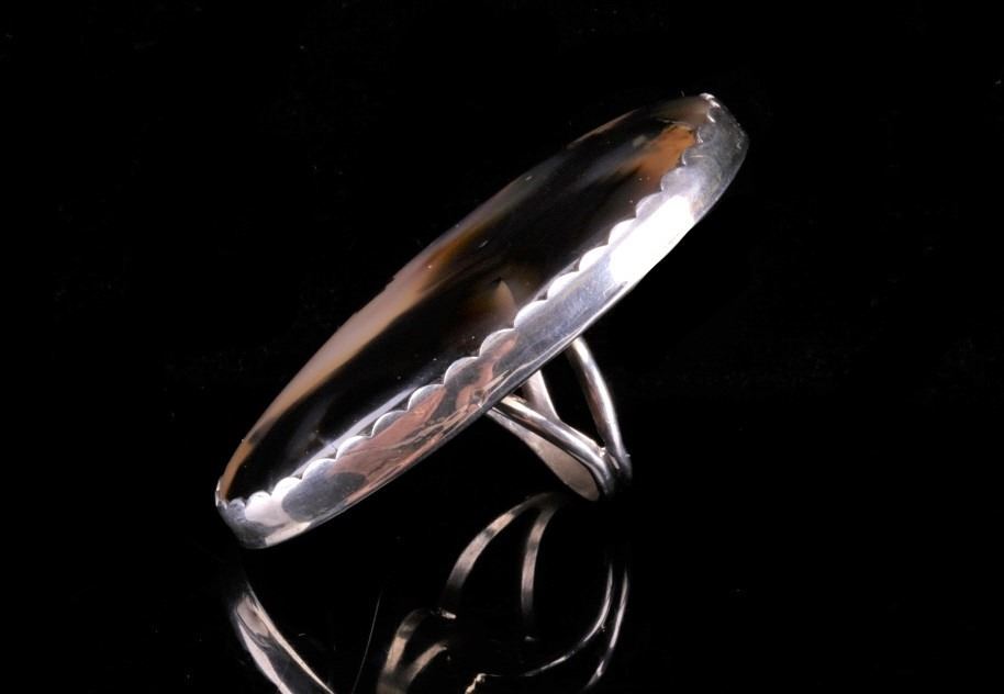 Featured in this lot is this sterling silver and dark Montana Moss agate ring from Navajo artist Billy Slim. The ring shows a gigantic, oval cut dark Montana Moss Agate cabochon set to a sterling silver split shoulder ring with the artist’s hallmark on the bottom of the ring, above a 'sterling' stamp. The condition of this ring is good, with no obvious signs of damage. The measurements of this ring are 7/8" x 2 1/4" x 1 1/2" and the ring size is US 6 1/2. The collective weight of the ring is 39.7g.