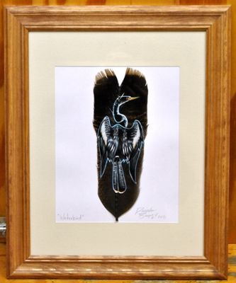 Painting is titled "Waterbird". Frame measures 16-1/2" tall by 13-1/2" wide. Feather measures 9-1/4" tall by 3-1/4" wide.