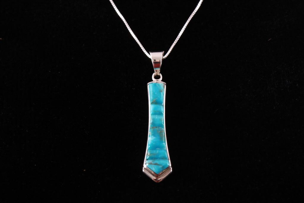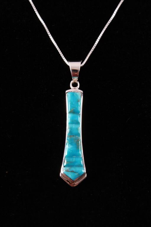 This is an excellent sterling silver necklace set with gem quality Bisbee Turquoise from master silversmith Navajo Julius Burbank. The piece is signed on the back "Julius Burbank Sterling (C)" and shows a sterling heavy modern design with stepped setting showing excellent mirco-inlaid turquoise with brigh rich blue gem quality turquoise from the Bisbee Turquoise Mine. The piece is strung on a .925 sterling silver box chain link necklace strand that is 18"L The pendant is 2.25"L. Total weight is 7.8 grams.
