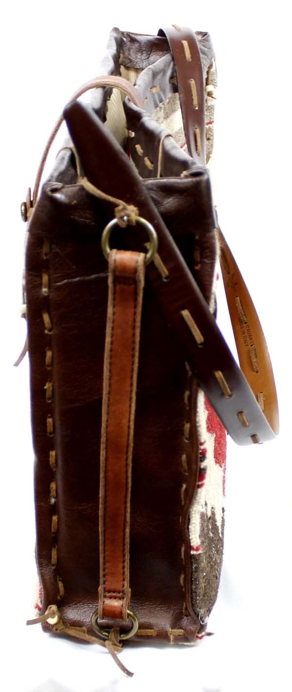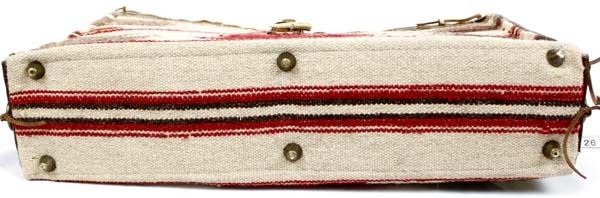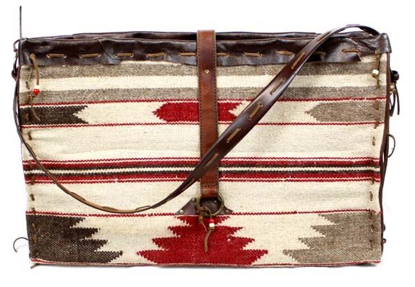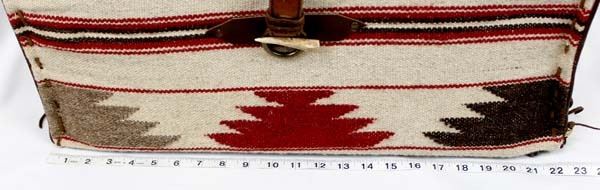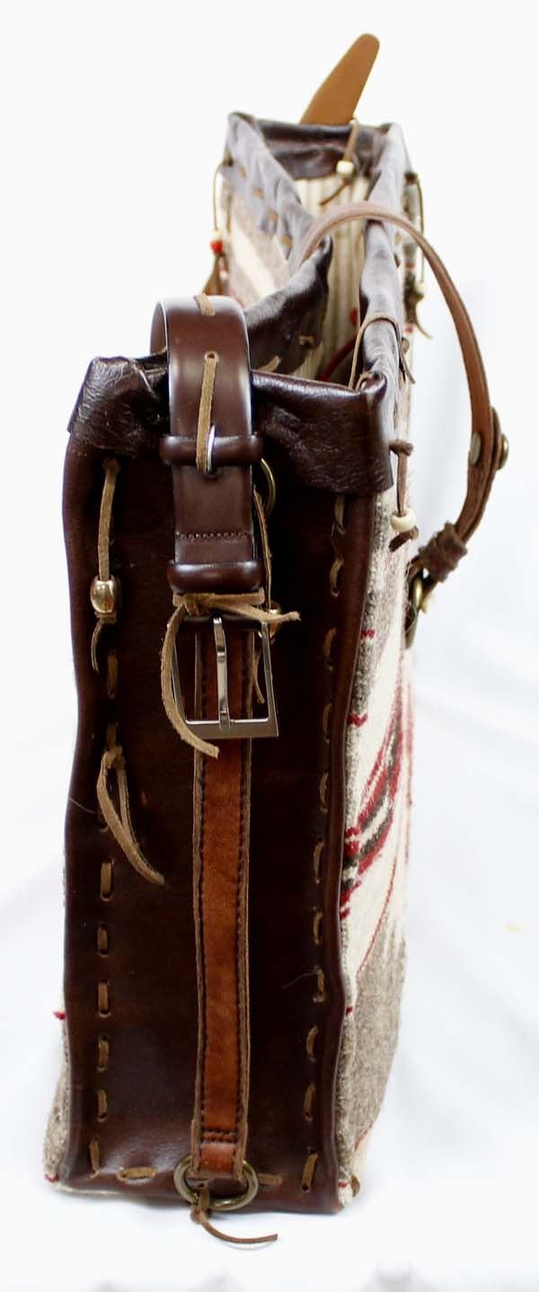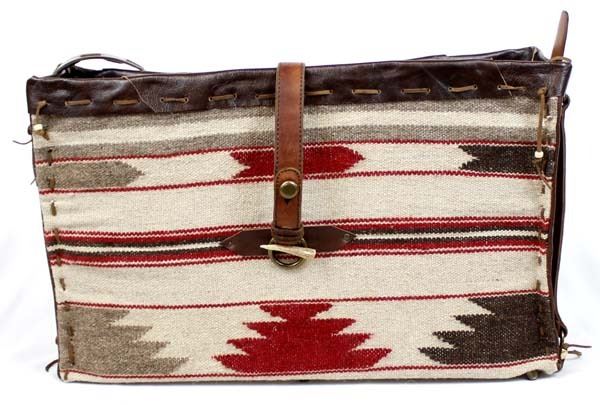 One of a Kind Navajo Blanket Overnighter Tote by George Smith, beautifully crafted using a Navajo blanket, leather, brass hardware, and pony beads, gorgeous southwestern colors, measures 13'' x 22.5'', two open pockets inside pockets and 1 zippered inside pocket