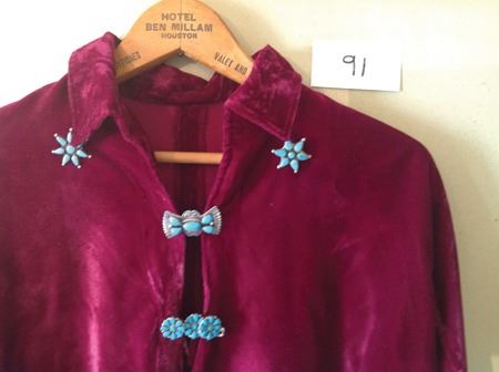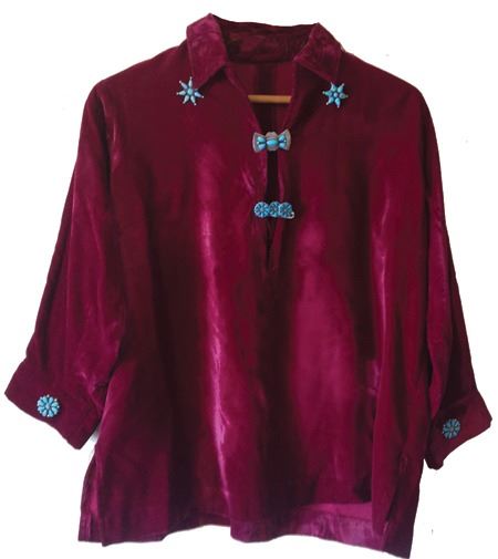 Ca. 1970s-1980s, Traditional velvet blouse with vintage Navajo turquoise and silver pins and buttons. Very good condition. 24" long,16" across shoulders