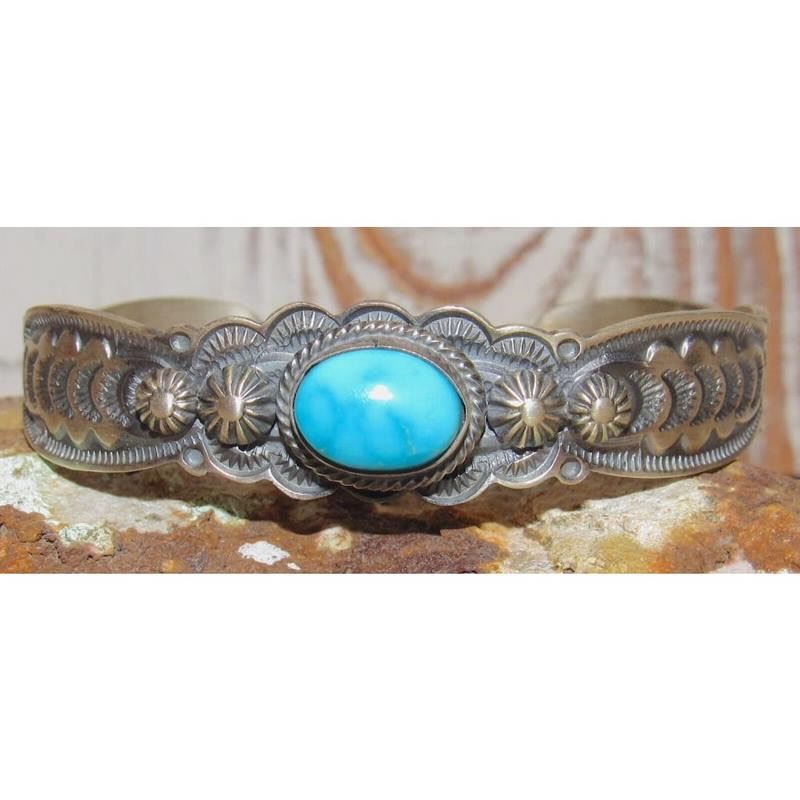 Phenomenal sterling silver & blue Royston mine turquoise Native American Navajo stacker cuff bracelet by the Navajo artist Bennie Ramone. Wonderful craftsmanship and attention to detail, intricately hand stamped tribal design. The inside circumference is about 7" including the gap. The gap is about 1 1/2". The cuff is adjustable. Stamped sterling, signed by the artist. Beautiful example of wearable Native American art to add to any jewelry collection. Great to add to your stacker cuff collection!