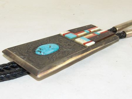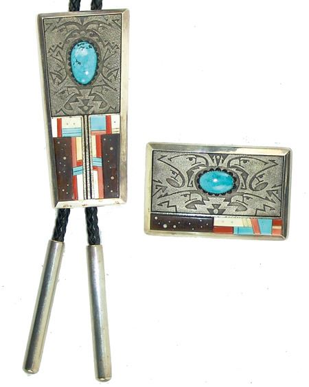 Early 2000s, Two exquisite contemporary all-silver pieces with textured overlay design eagle heads with beveled backs, each containing a single turquoise stone and fine raised and carved inlay features. Very good condition. Retail $2400. Bolo 4-1/4" x 2-1/4", 2-1/4" x 2-1/4"