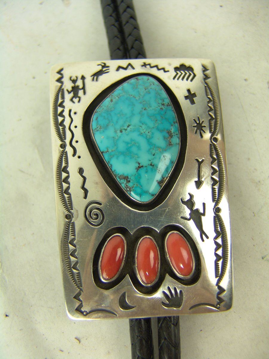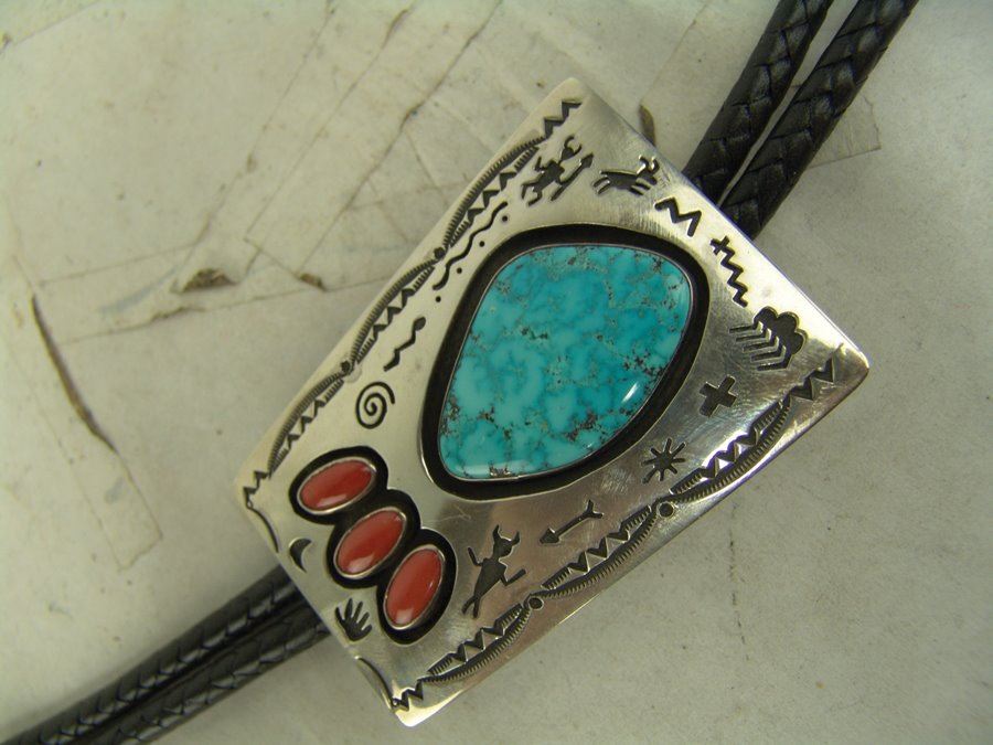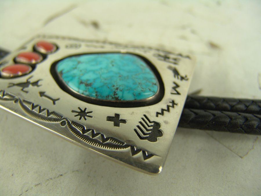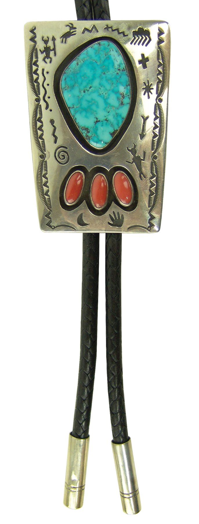 Impressive, all silver bolo tie done in shadowbox and overlay style with fine stamp work, interesting symbols and figures, three red coral stones, and a large beautiful Blue Gem turquoise stone, and with custom tips.,,3-1/2" x 2-3/8"