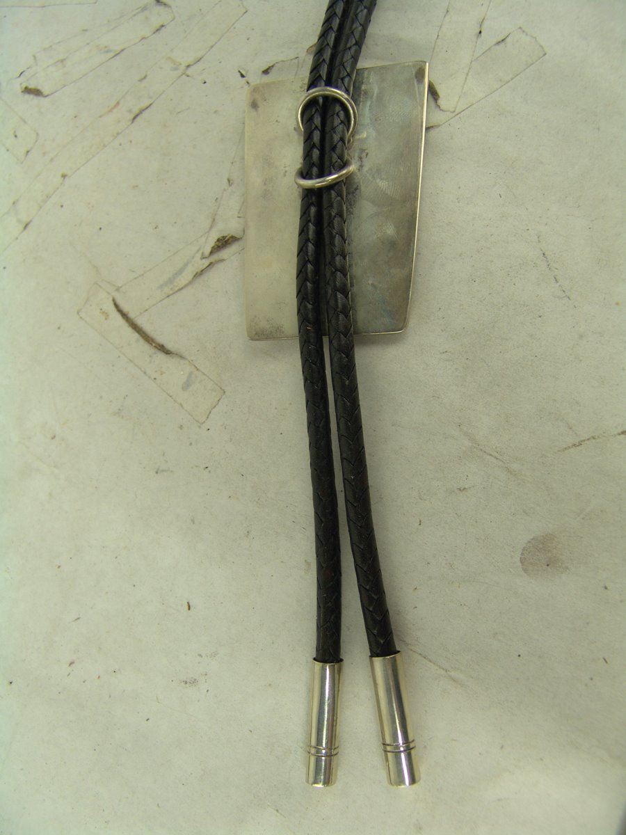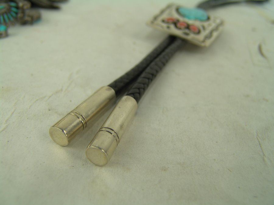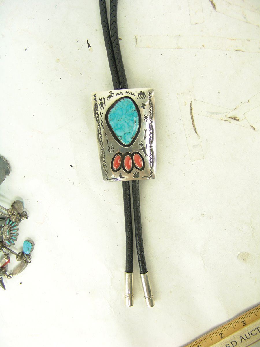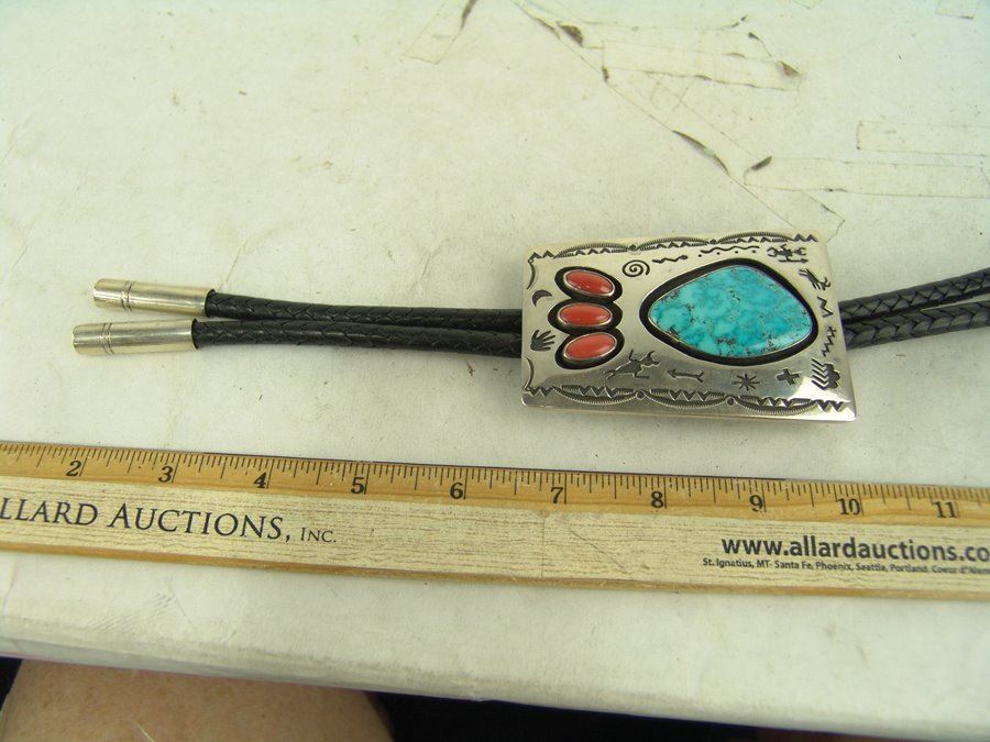 Impressive, all silver bolo tie done in shadowbox and overlay style with fine stamp work, interesting symbols and figures, three red coral stones, and a large beautiful Blue Gem turquoise stone, and with custom tips.,,3-1/2" x 2-3/8"