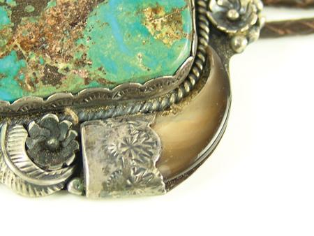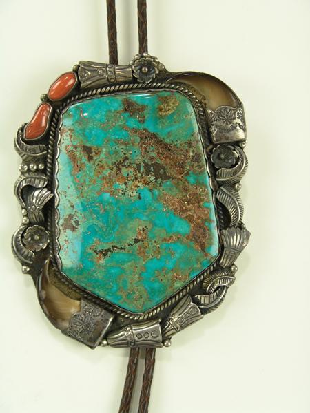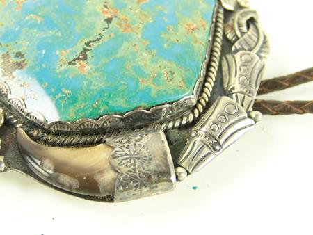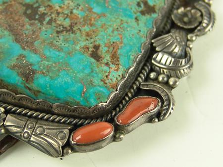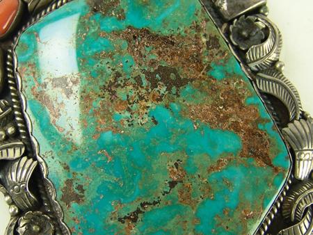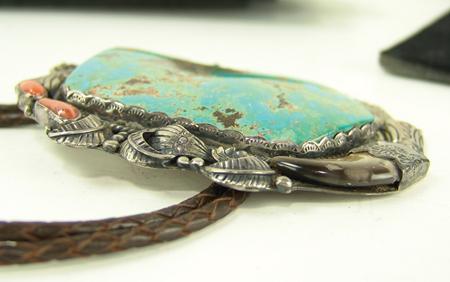Circa 1970s, Large one-of-a-kind silver backed bolo slide set with two corals, two bear claws, and a huge polished stormy mountain turquoise stone. Very good condition, hallmarked. 4-1/2" x 3-1/2"