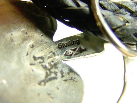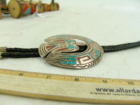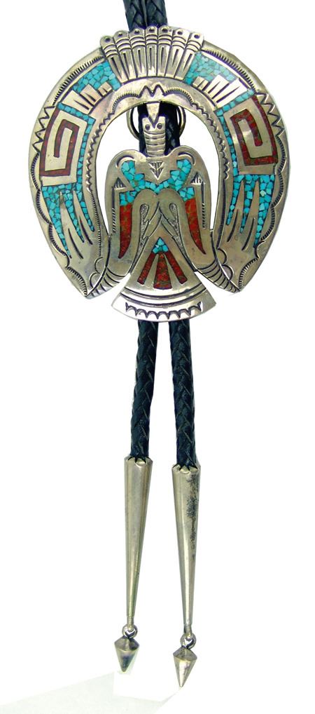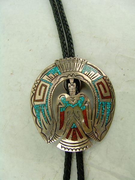 Ca. 1970s, Large and impressive Singer-style all-silver chip inlay featuring a peyote bird in turquoise and coral. Very good condition. Hallmarked. 46" long, 3-1/2" x 3"