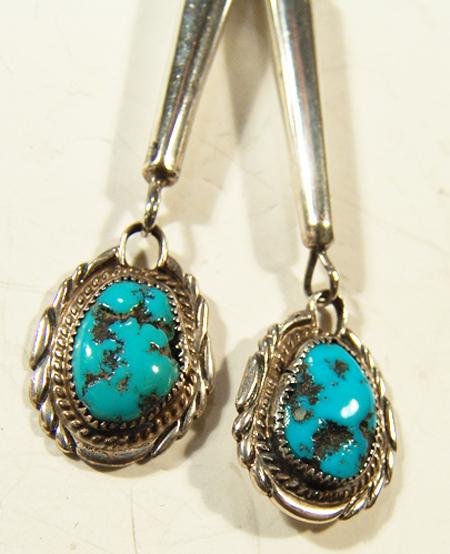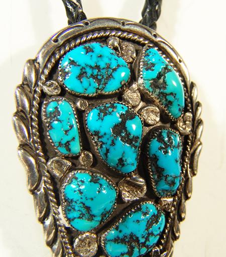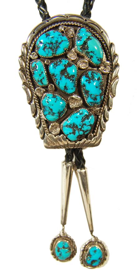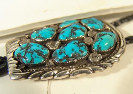 Horseshoe shaped motif of heavy silver with seven Nevada turquoise cabochons and matching tips. Hallmarked HTM. 2-1/2" x 2"