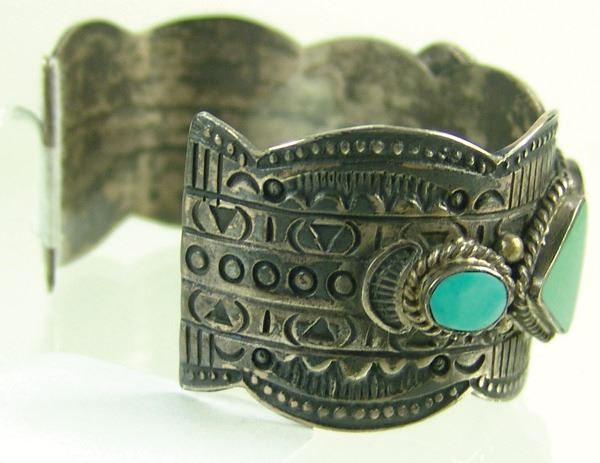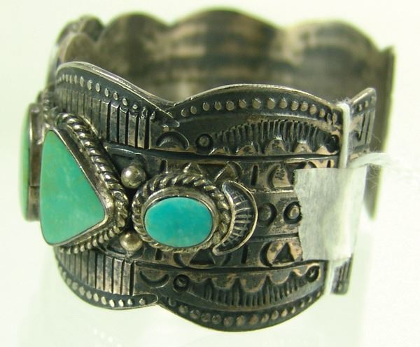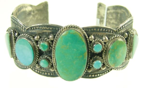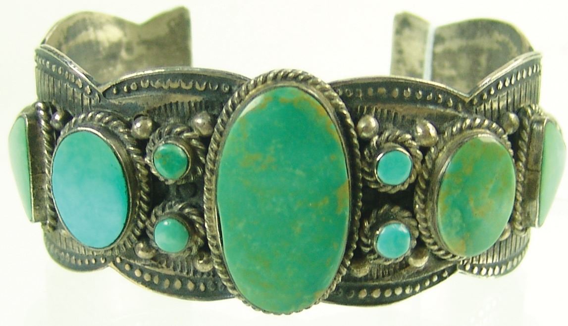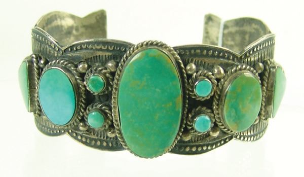 Vintage, 11-stone, green turquoise and stamped silver cuff bracelet with fine rope work and appliques. Very good condition, nice patina.Ca. 1980s6-38/" + 1-1/4" x 1-1/4"