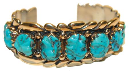 Circa 1970, 14KT gold cuff bracelet set with thirteen sculpted natural turquoise cabazons, sterling interior. Hallmarked "AQ." 6" x 1" + 1" gap