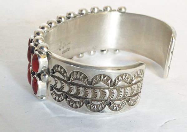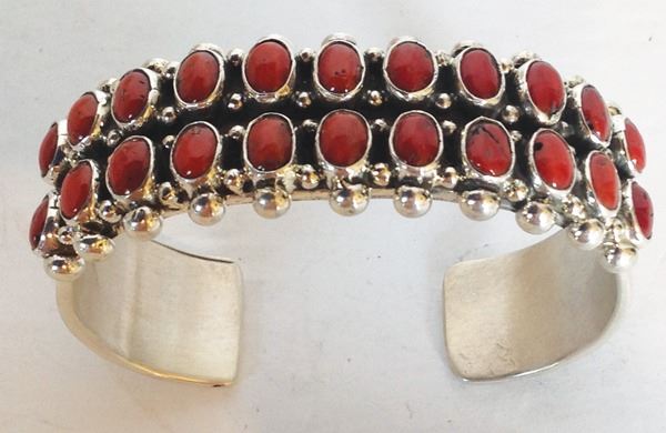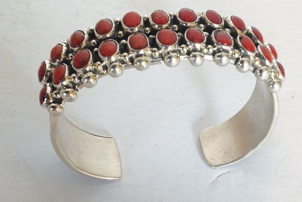 Very fine, heavier gauge, all silver bracelet with 22, individually hand cut and set, oxblood red coral stones. Very good condition.Late 1900s5-1/4" + 1" x 3/4"