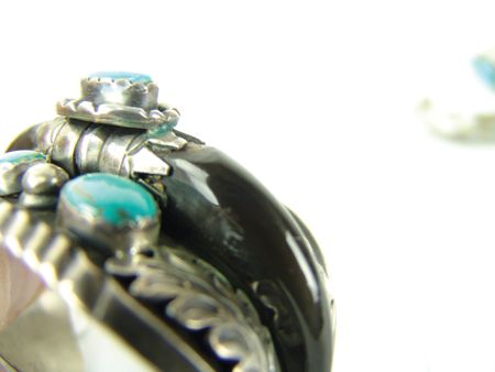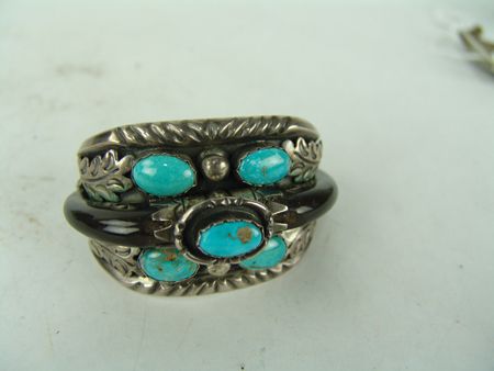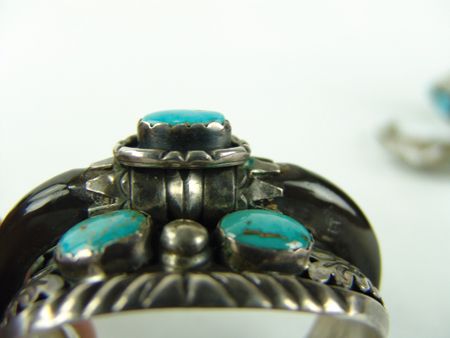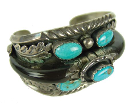 Ca. 1970s, Unique original design heavy gauge turquoise and silver bracelet with two bear claws. Very good condition, nice patina. 5-1/4" + 1-5/8" x 1-3/4"